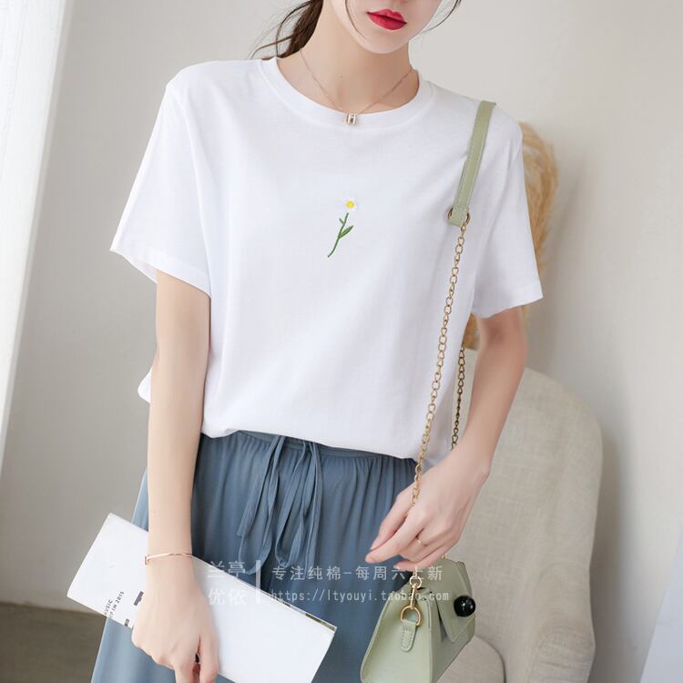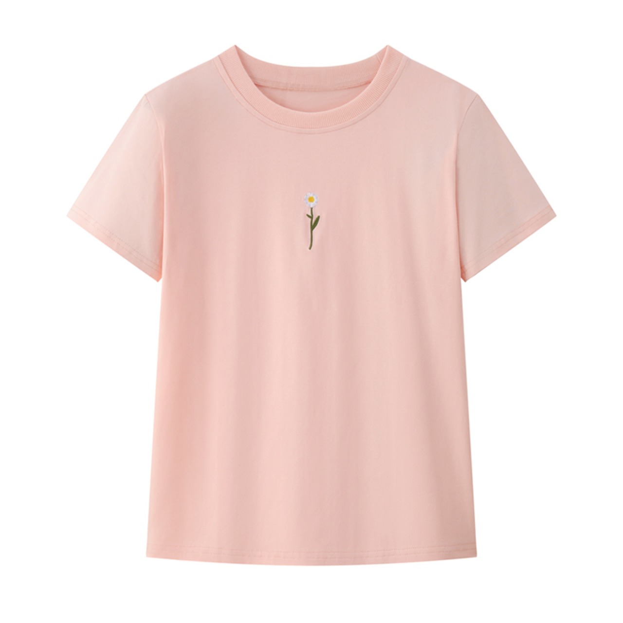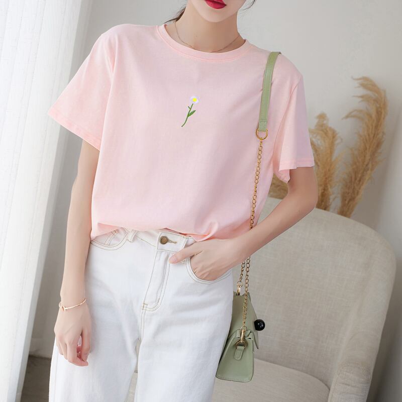 ピンクの刺繍が施された半袖の快適なコットンTシャツの女性の2020年夏の新しいスリムで薄いラウンドネックのトップトレンド レッド サマー 夏物 Oネック TB2-16 TB2-1651320728656