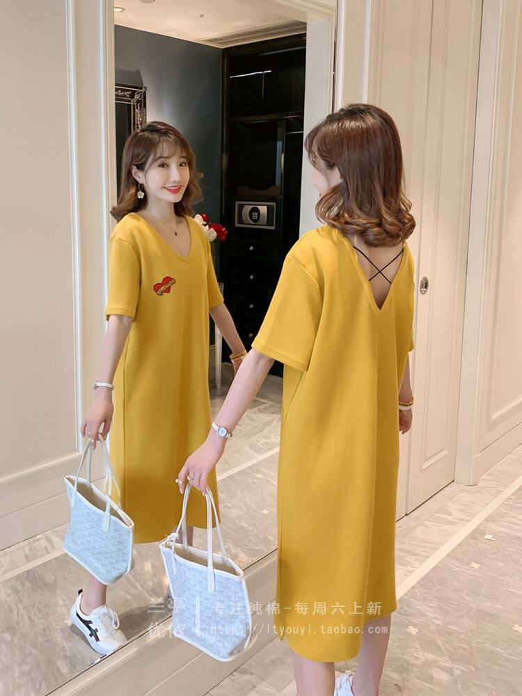 夏の新しいミドル丈中空Vネック純綿半袖Tシャツスカート女性のセクシーな背中の開いたトップドレスのトレンド コットン サマー 夏物 ピュア TB2-16 TB2-1687702551124