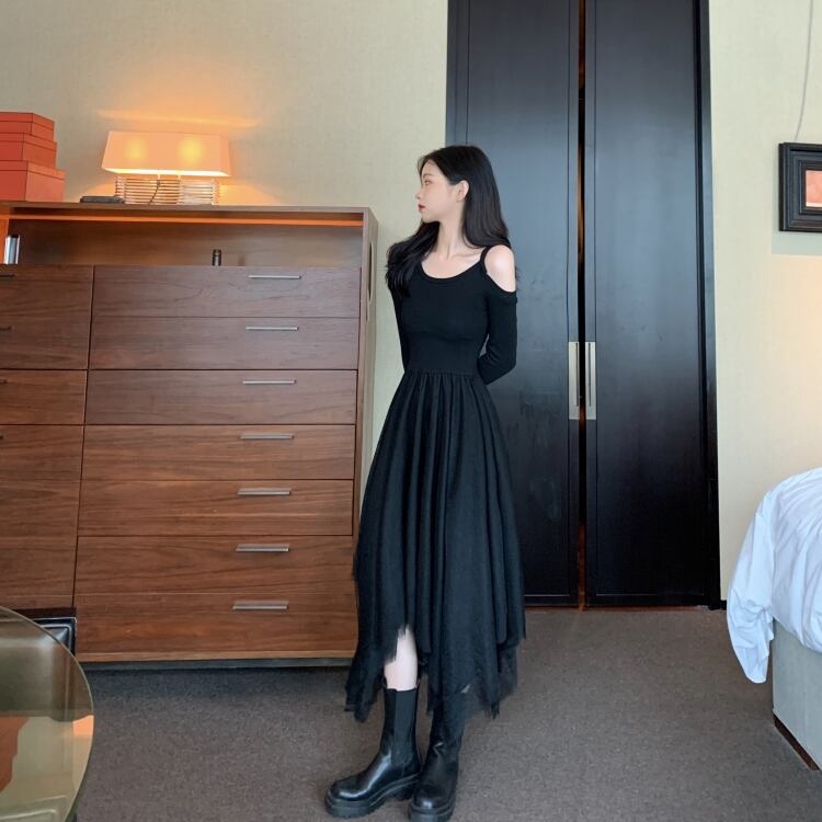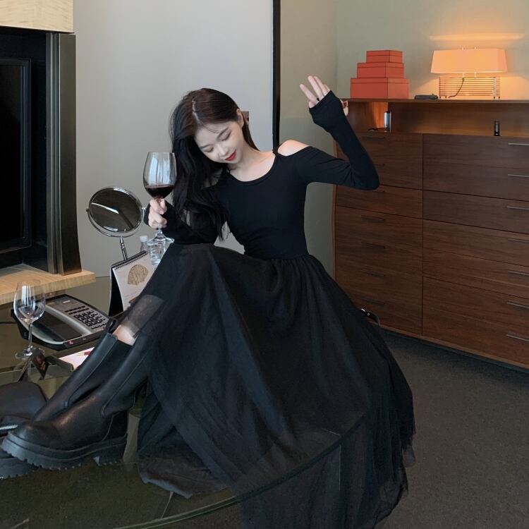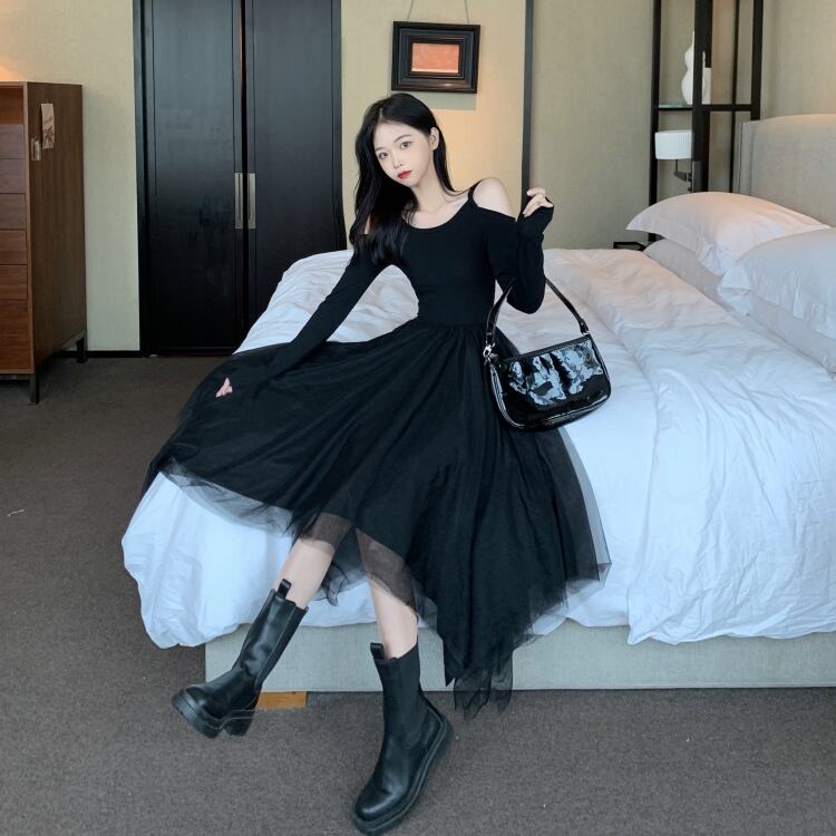 ファットシスタープラスサイズ秋フレンチレトロ薄いリトルブラックドレスセクシーなストラップレス気質ドレススーパーフェアリーメッシュスカート 大きめサイズ オータム 秋物 TB2-10 TB2-1079348887297