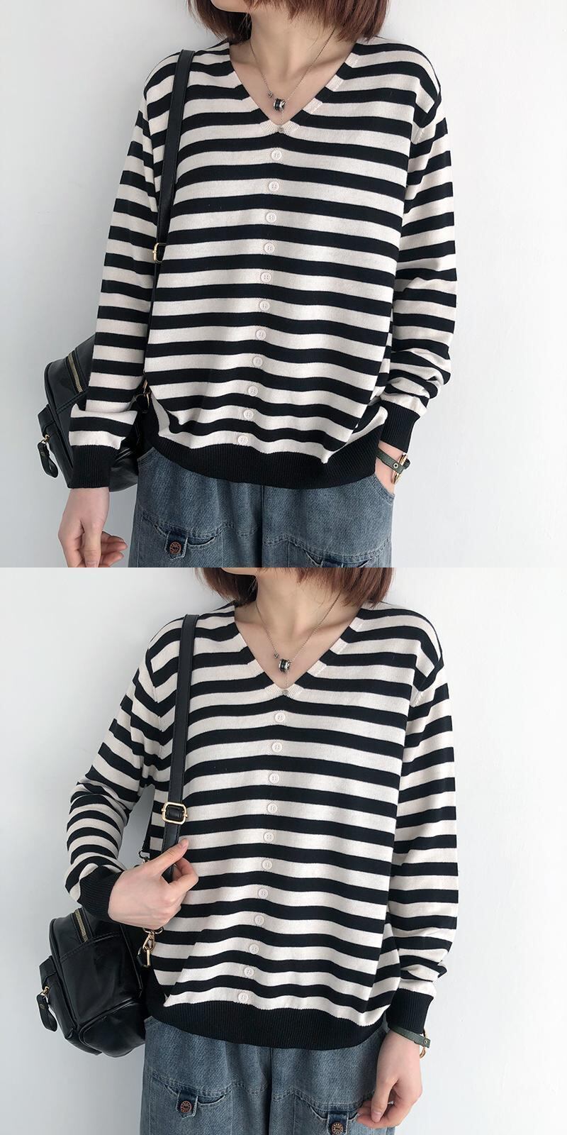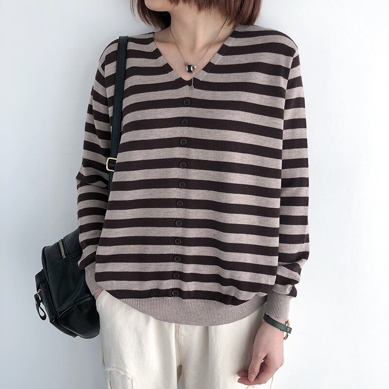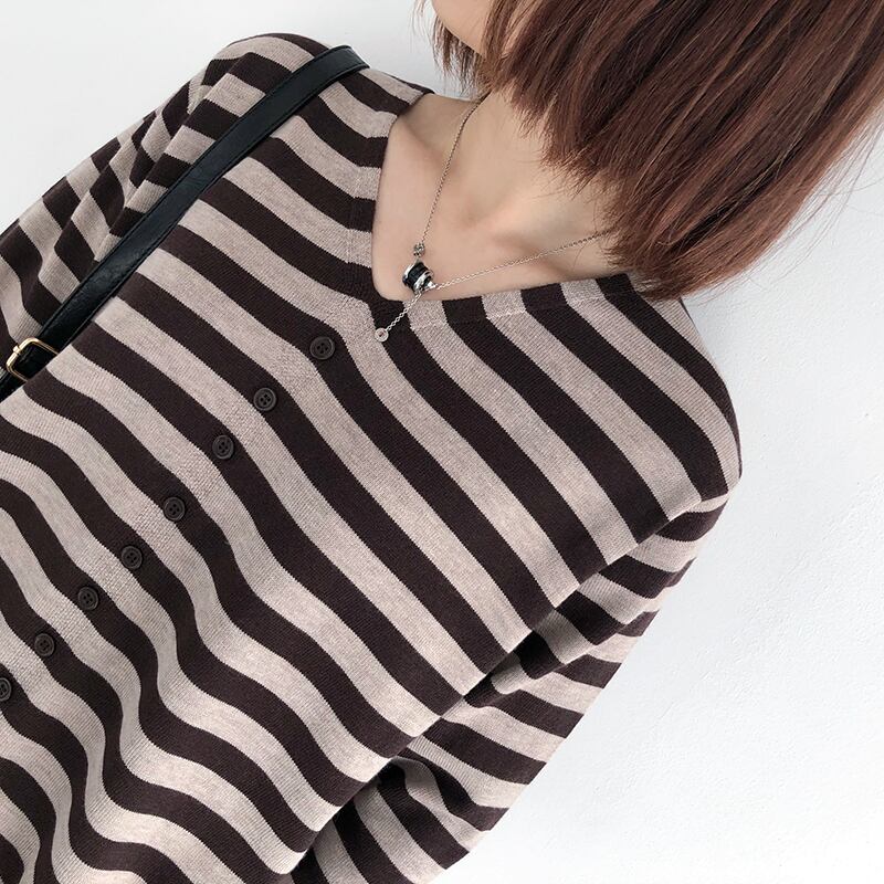 2021年春秋新作カジュアルルーズストライプワイルド長袖シャツ文芸レトロヘッジVネックセーター女性 ロング スプリング 春物 オータム 秋物 TB2-9 TB2-995770113122