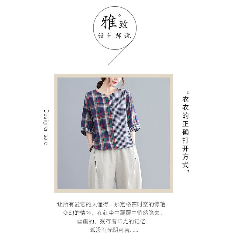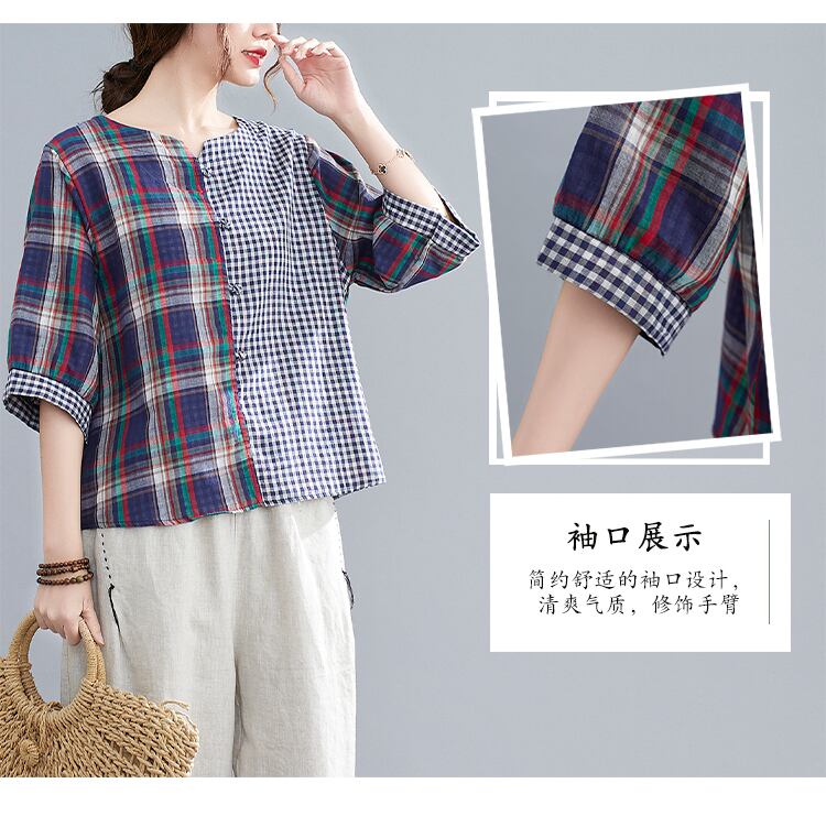 2021年夏の新しいTシャツバージョンのファットmmコットンとリネンステッチチェック柄ルーズワイルドシン半袖シャツ女性 サマー 夏物 TB2-12 TB2-1210431435344