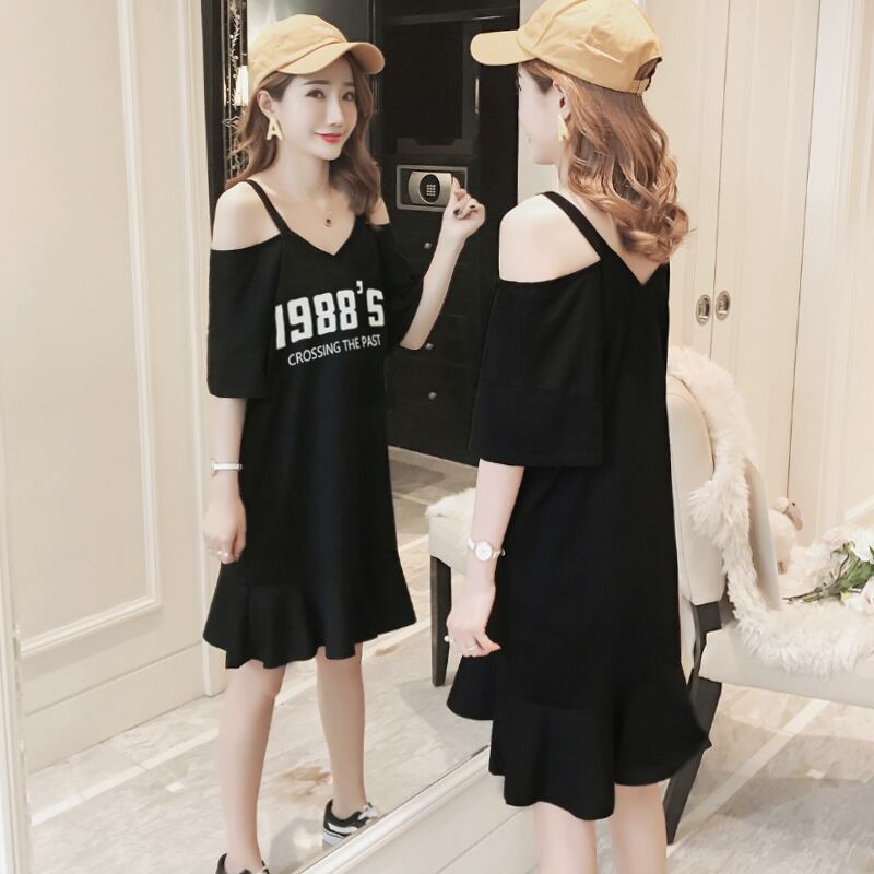 夏のプラスサイズの女性のルーズコットン半袖Tシャツ女性の腹ミドル丈オフショルダートップフィッシュテールドレス 大きめサイズ サマー 夏物 TB2-16 TB2-1622706063799