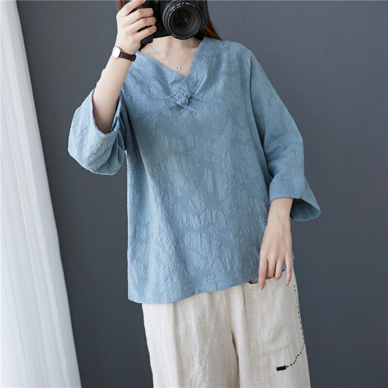 2021年の新しい春と秋の綿とリネンの長袖ディスクボタンエスニックスタイルの中国のTシャツシンプルで用途の広い無地のトップ女性 ロング コットン スプリング 春物 オータム 秋物 ソリッドカラー TB2-12 TB2-1222071035887