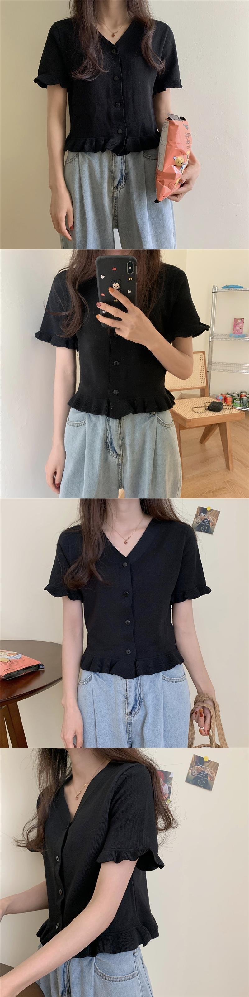 夏の新作スタイルのアイスシルクニットセーター、木製の耳、女性用半袖黒VネックカーディガンショートTシャツヒョナスタイルトップ ブラック サマー 夏物 TB2 TB242233683850