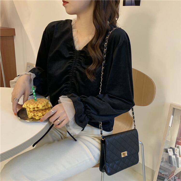 2021年春の女性の鎖骨トップスキームデザインニッチVネックゴールドベルベットブラックシャツ女性の春 スプリング 春物 TB2 TB214362805907