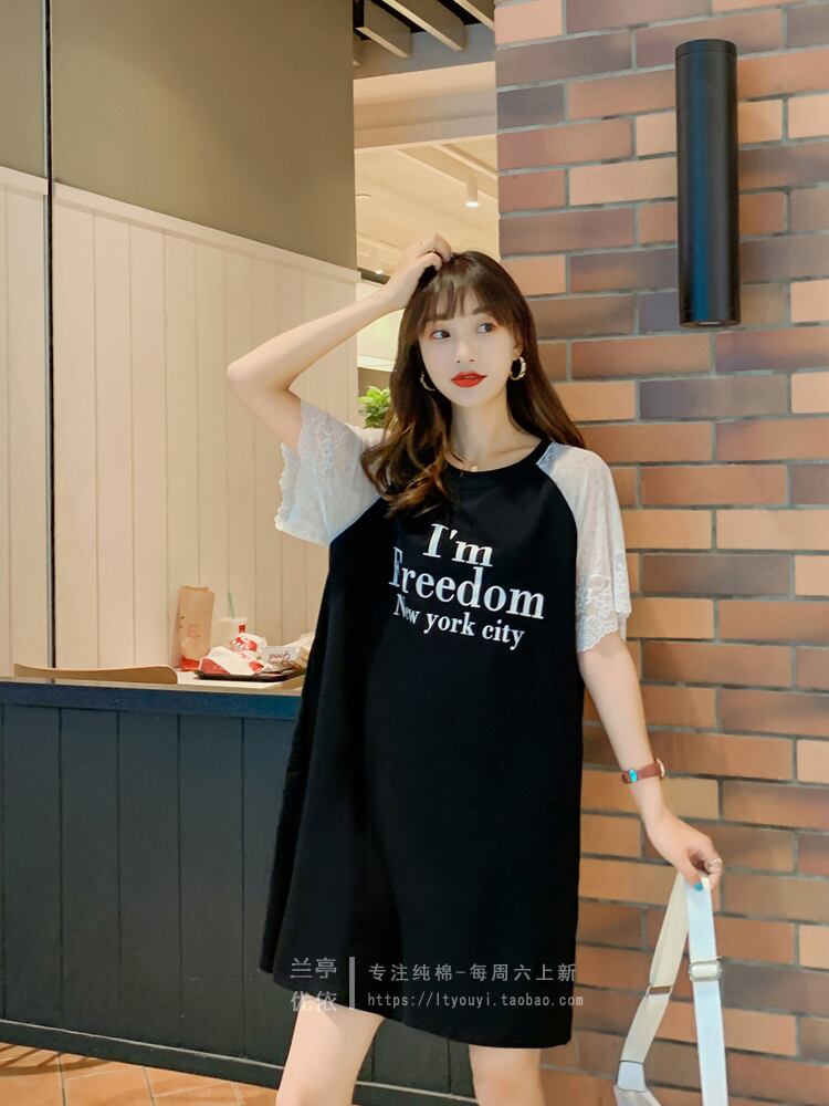 2021年の新しいプラスサイズの女性の黒いメッシュのステッチドレス女性の夏の妖精の気質ミドルレングスのTシャツスカート春 ブラック 大きめサイズ スプリング 春物 サマー 夏物 TB2-16 TB2-1628440098843
