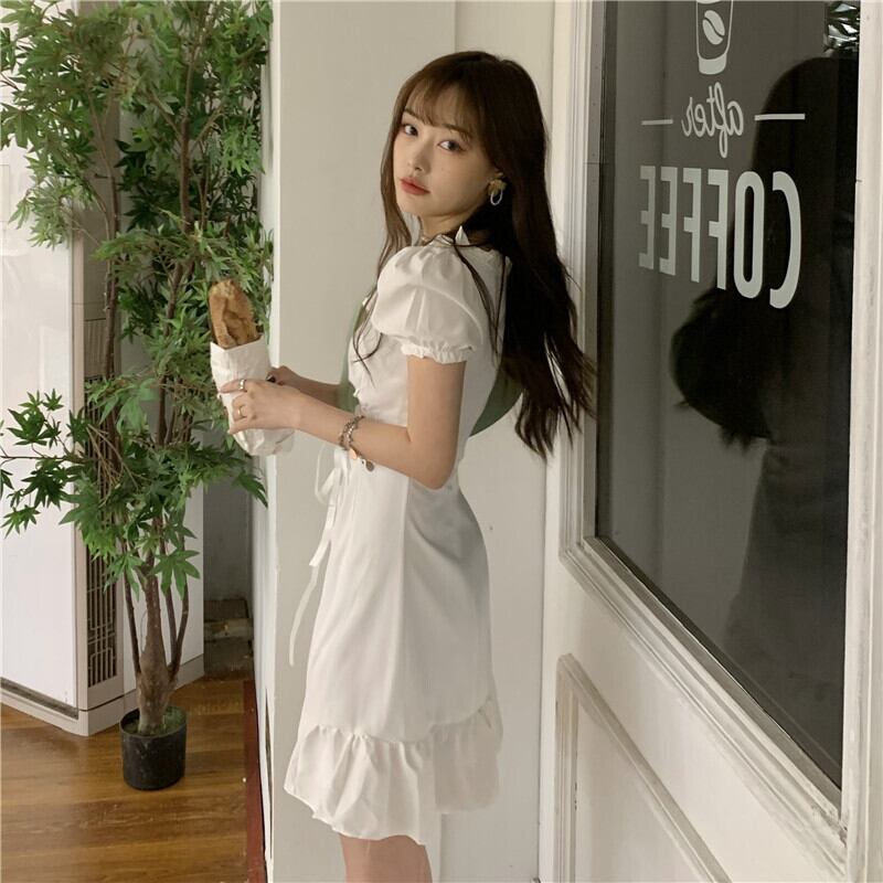150の小さな背の高い白いパフスリーブドレス女性の夏フレンチスクエアカラーウエストスリミングフリルスカート ホワイト サマー 夏物 スクウェア TB2 TB289670227128
