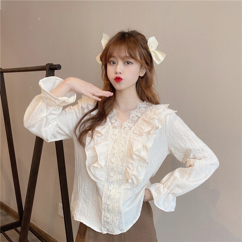 2021年初春新作フリルシャツ女性デザインセンスニッチレースステッチトップVネックプルオーバーシャツトレンド スプリング 春物 TB2 TB239112070576