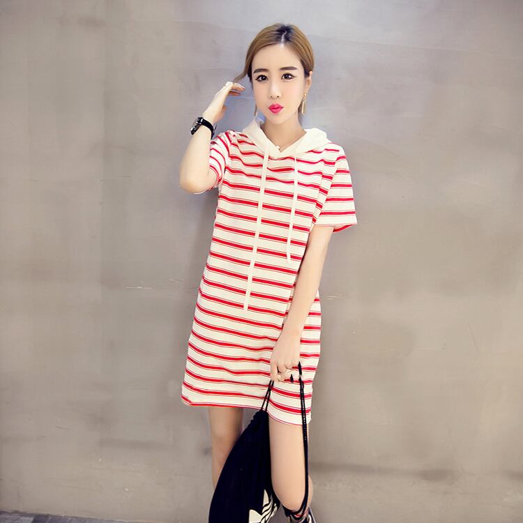 2021年夏のニュースタイルラージサイズルーズスリムフード付き純綿半袖Tシャツスカートストライプミドル丈Tシャツ女性春 コットン 大きめサイズ スプリング 春物 サマー 夏物 ピュア TB2-16 TB2-163187981711