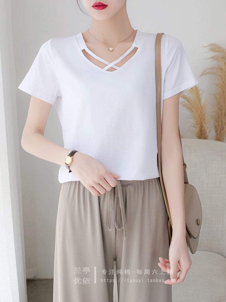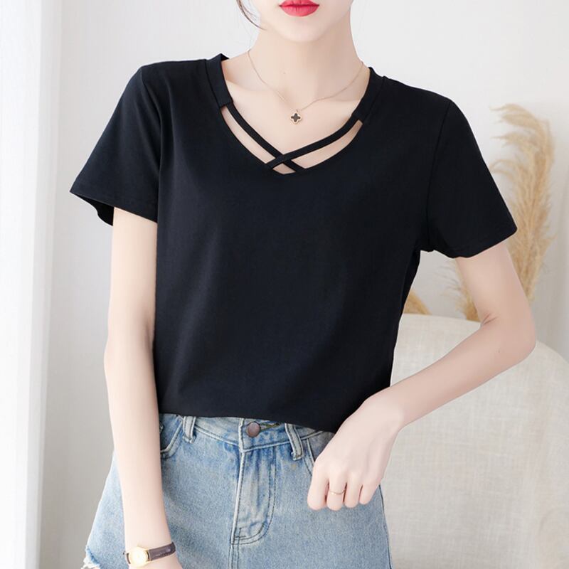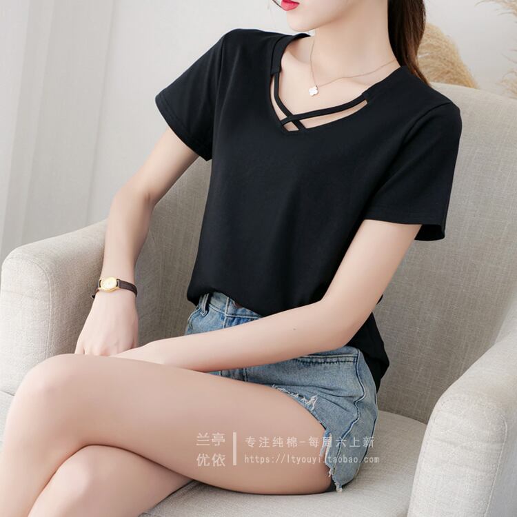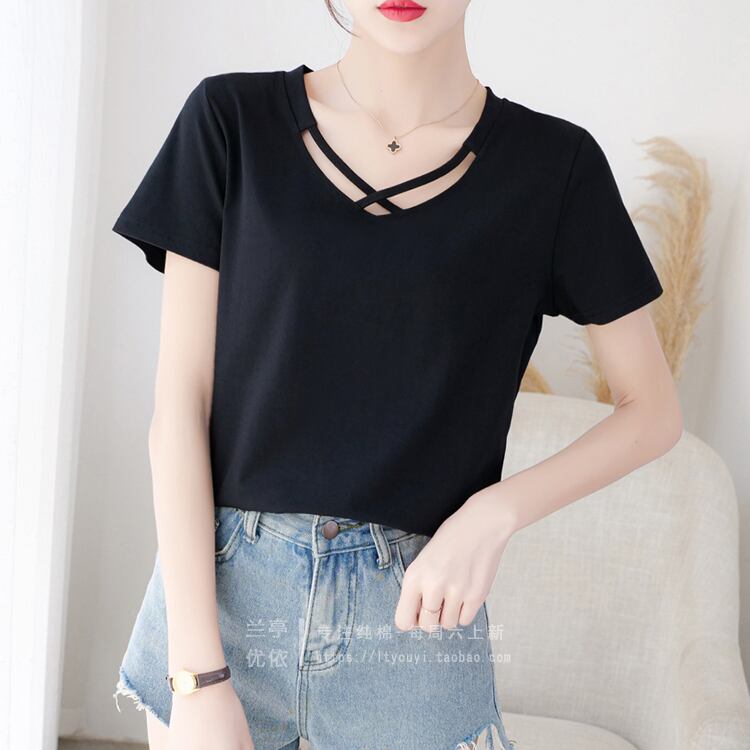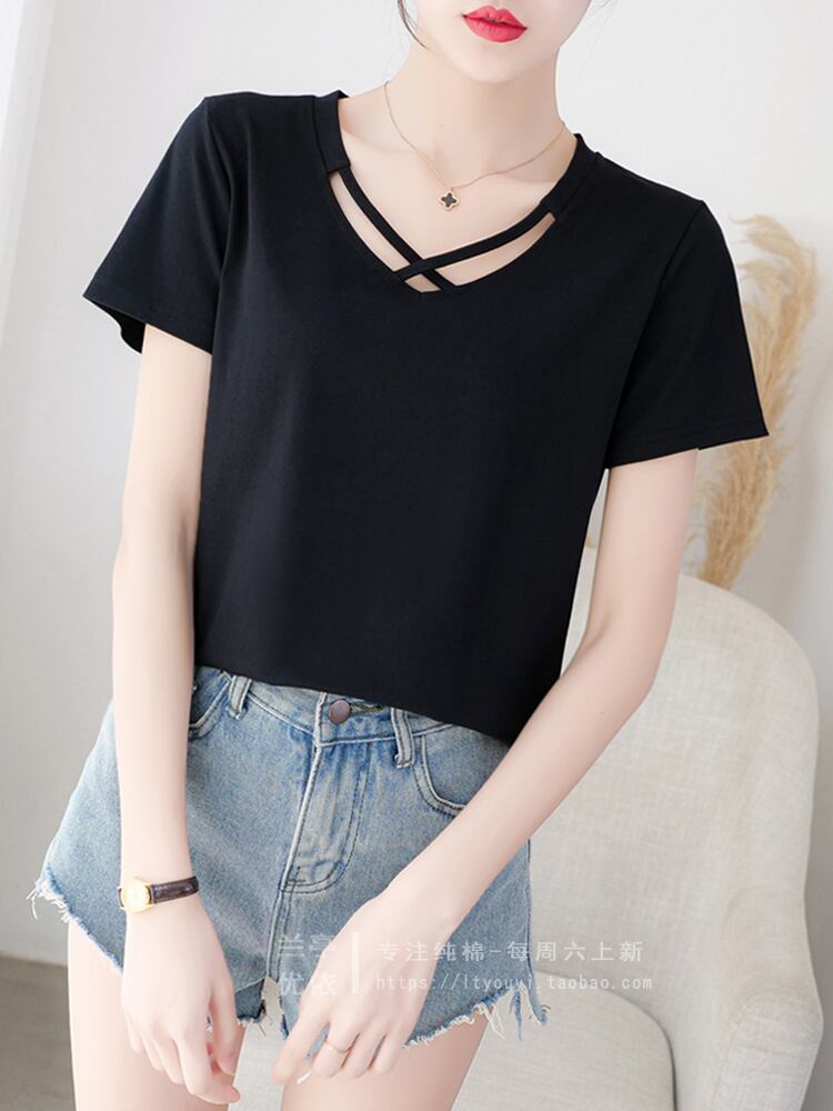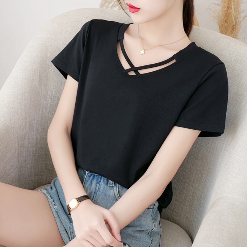 ピュアコットンブラック半袖女性中空VネックTシャツ学生サマードレスシンプルルーズラージサイズトップバージョンのワイルドイン 大きめサイズ 夏物 TB2-16 TB2-1647602974935