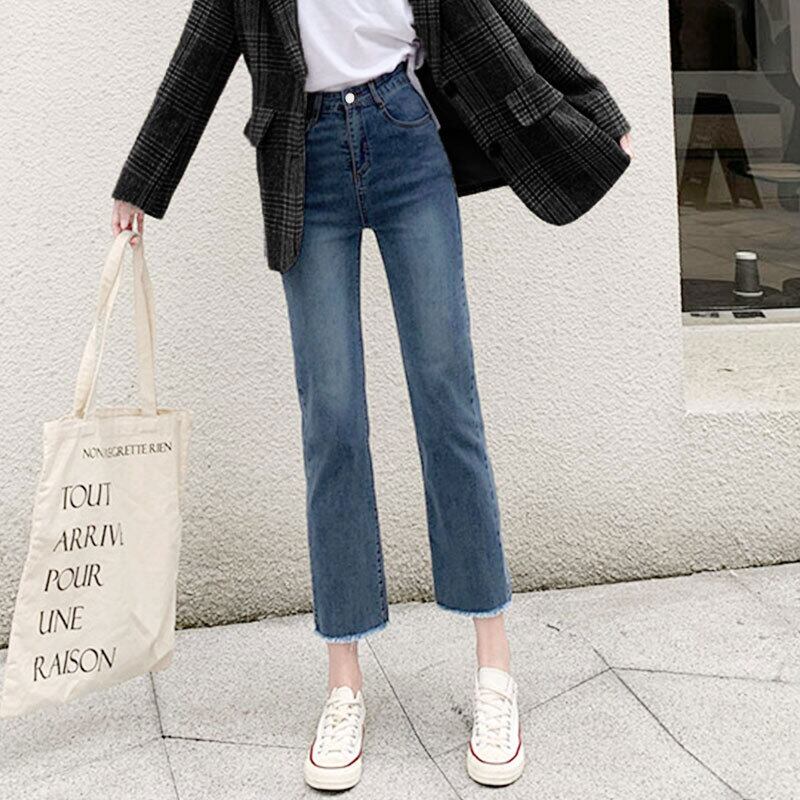 ダークストレートレッグジーンズの秋冬のレディースパンツは、ゆったりとしたマイクロフレア、ゆったりとしたハイウエスト、薄いグレーのズボンを着用しています ハイウェスト オータム 秋物 ウィンター 冬物 TM2-5 TM2-555660633017