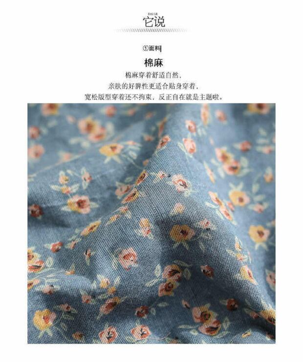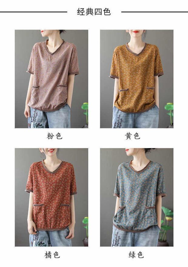 大きいサイズのカジュアルな夏の新しいレトロな文学的な花柄の綿とリネンのシャツは薄いVネック半袖ルーズTシャツ女性の野生でした コットン 大きめサイズ サマー 夏物 TB2-11 TB2-1156583765824