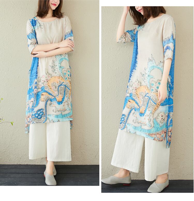 2020年夏の文学とアートレトロな綿とリネンのスーツルーズワイドレッグパンツファッションプリントスプリットドレスツーピース女性 コットン サマー 夏物 ワイドパンツ TB2-8 TB2-825899519478