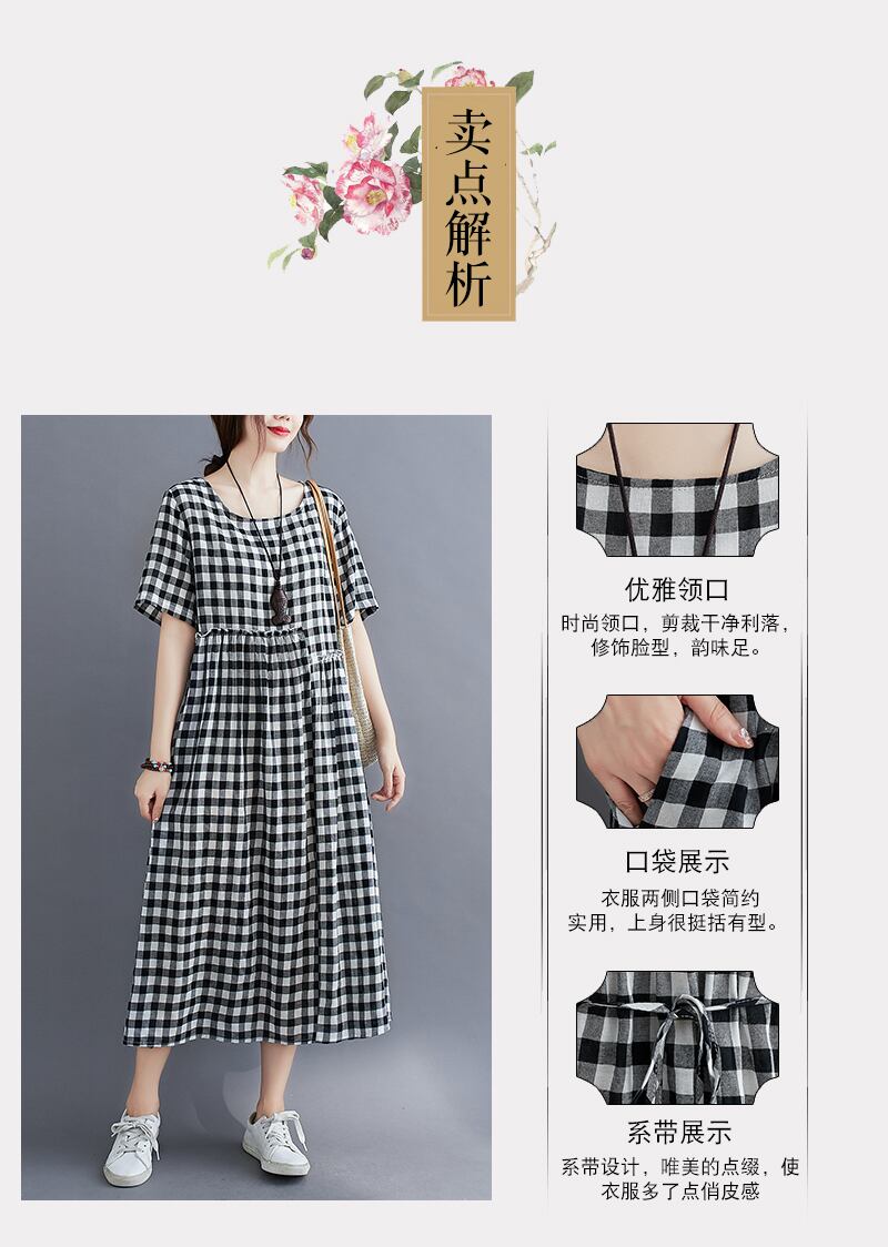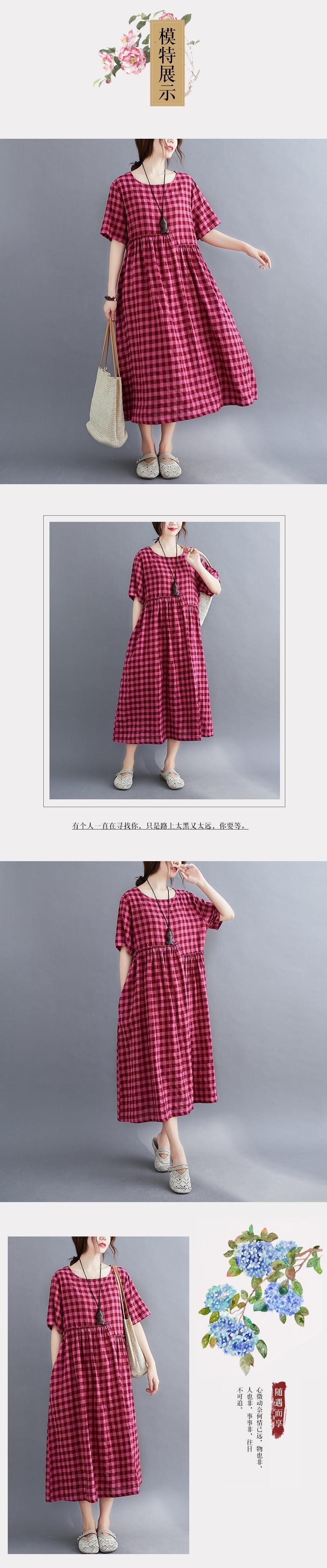2021年夏のレトロな文学と芸術の格子縞の綿とリネンのラウンドネック半袖ドレス女性のエレガントなワイドルーズラージスイングドレス コットン サマー 夏物 Oネック TB2-12 TB2-1265077739711