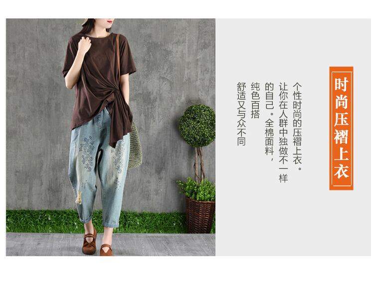 ルーズプラスサイズの女性のレトロな文学ファッションプリーツトップ無地ワイルド半袖コットンTシャツ不規則なサマードレス 大きめサイズ 夏物 ソリッドカラー TB2-11 TB2-1165361400955