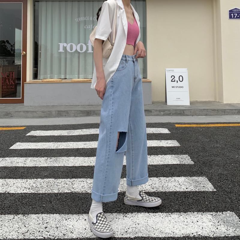 破れたジーンズレディースストレートシック風ハイウエストスリミングサマーライトカラードレープローズワイドレッグパンツモップパンツ ハイウェスト 夏物 TB2 TB287273154424