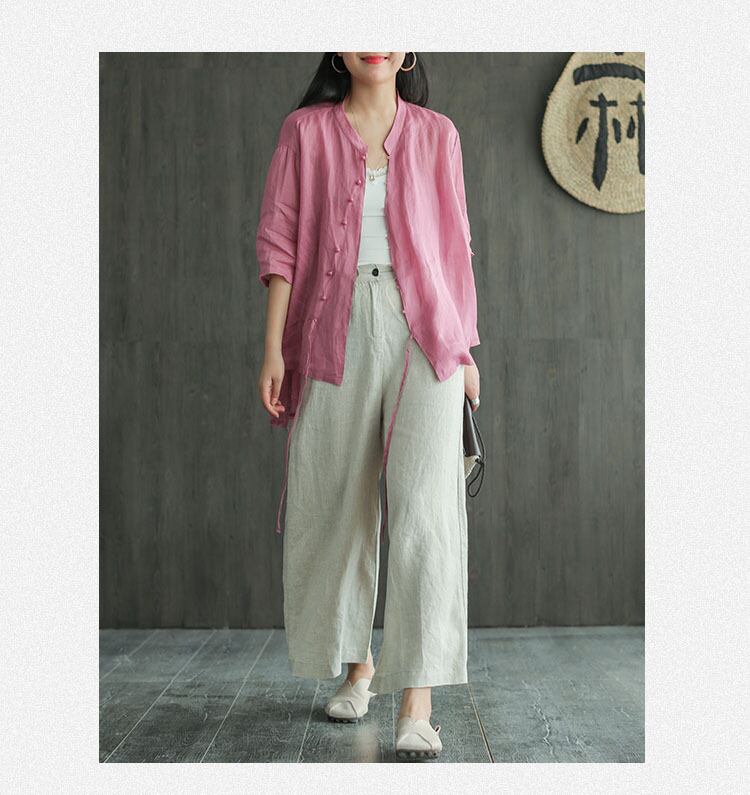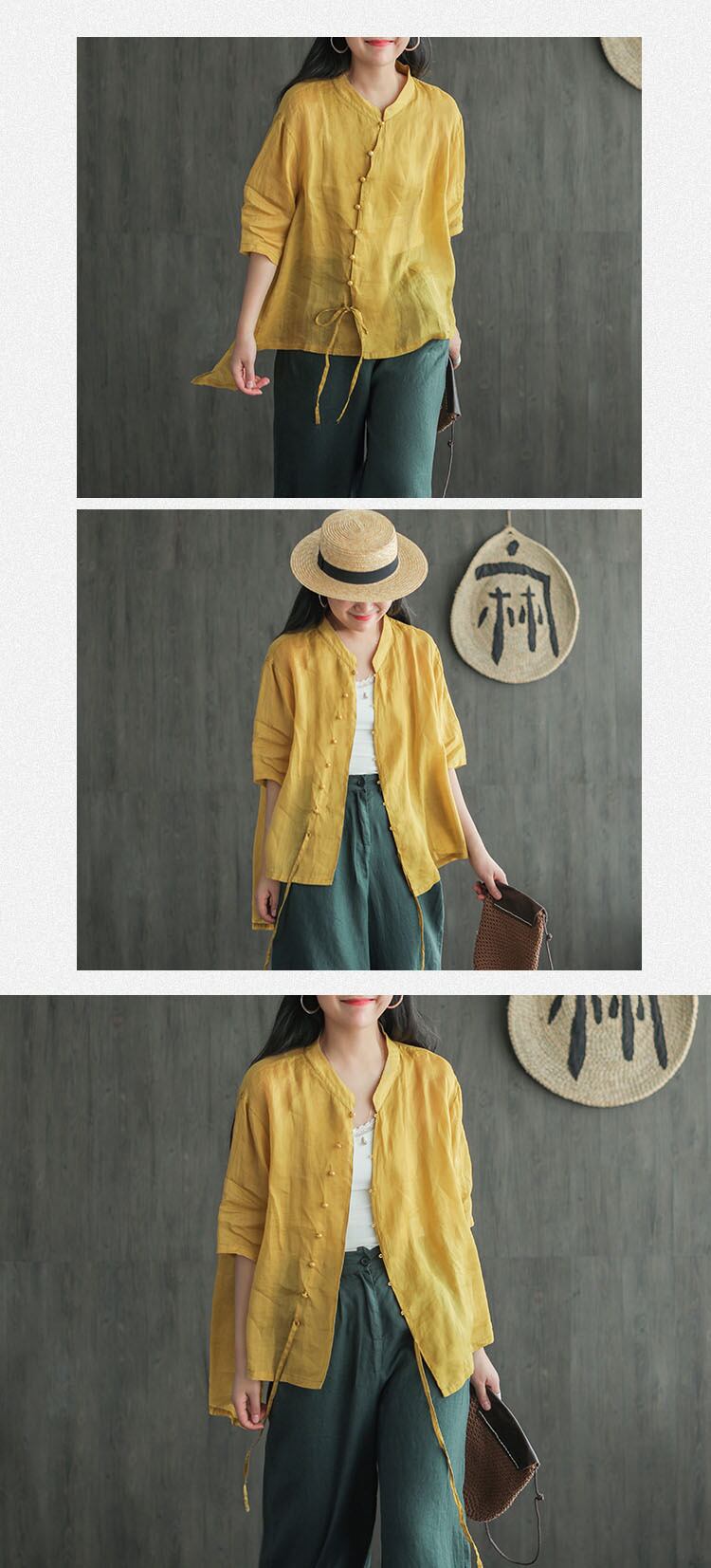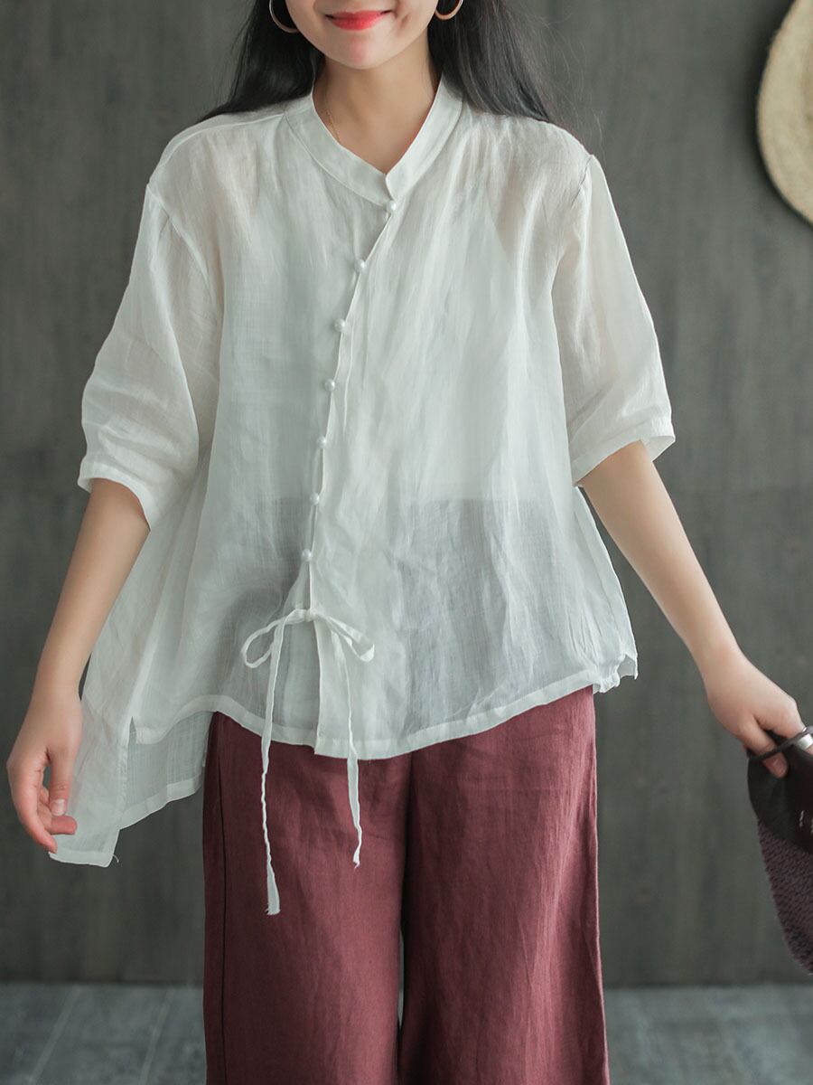 文学とアートのビーズボタンレースアップリネンシャツ女性ルーズシンセクションスタンドアップカラーシルクリネンシャツ夏の5点袖斜めシャツ サマー 夏物 TB2-11 TB2-1185039448856