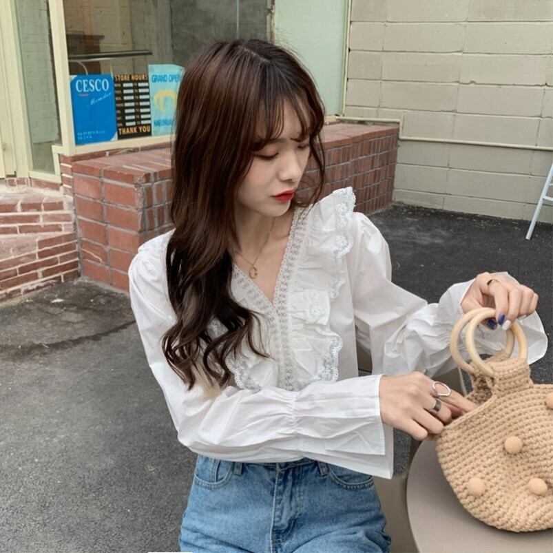 2021年春夏新作フレンチVネックトランペットスリーブホワイトシャツ女性デザインセンスニッチ気質長袖シャツトレンド ロング スプリング 春物 サマー 夏物 TB2-6 TB2-640166591860
