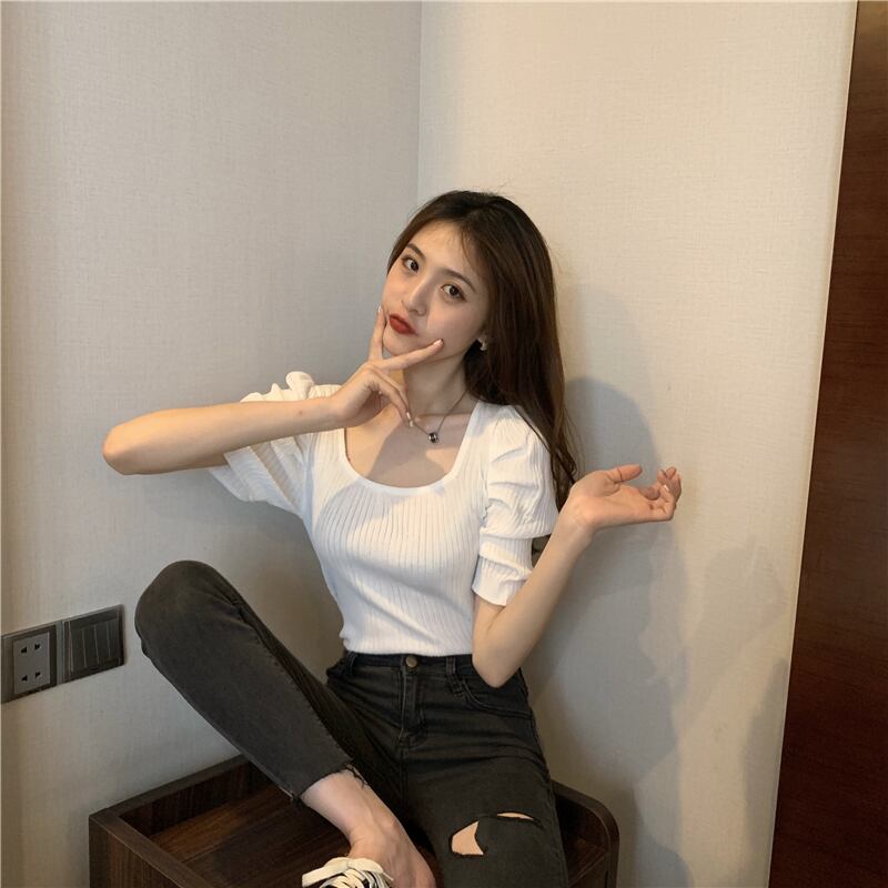 スクエアネックパフスリーブストライプニットTシャツレディース半袖スリムフィット鎖骨2021年夏新作センストップ サマー 夏物 スクウェア TB2 TB250246848703
