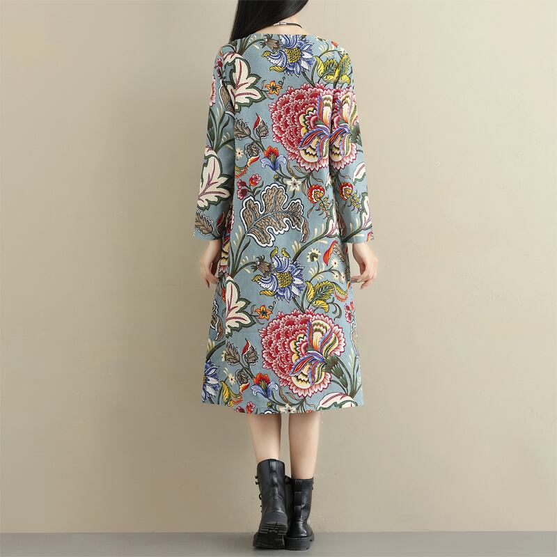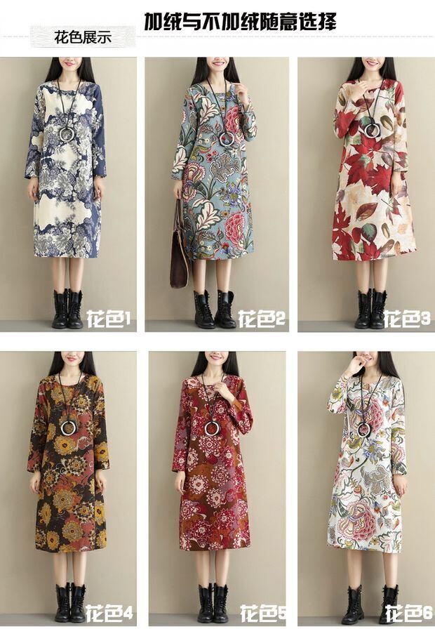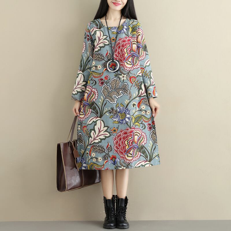 アートレトロコットンとリネンの長袖ドレス2018春と秋新しいルーズラージサイズスモールフローラルファットMMリネンロングスカート 大きめサイズ スプリング 春物 オータム 秋物 花柄 TB2-11 TB2-1153970205474