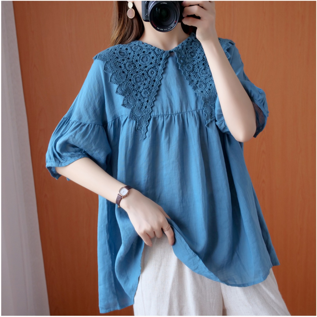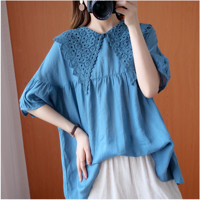 パフスリーブセンドールシャツレディース2020夏新作ルーズリテラシーレースネイビーカラーファッショナブルな半袖トップス サマー 夏物 TB2-8 TB2-862933987460