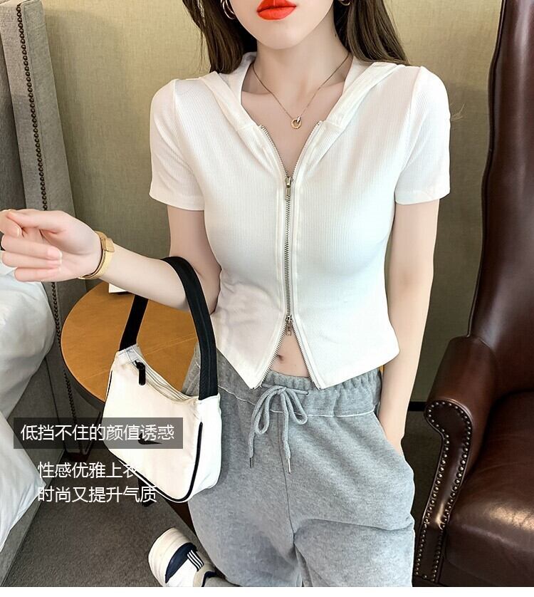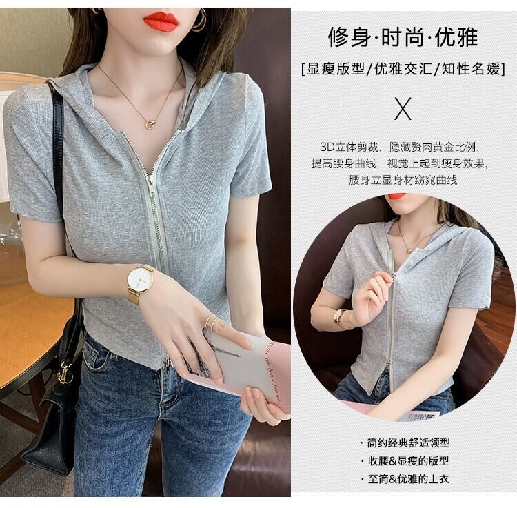 2021年夏の新しいスリムネットセレブリティインダブルジッパーショートハイウエストトップデザインセンスフード付き半袖Tシャツ女性 サマー 夏物 TB2-6 TB2-697917918679