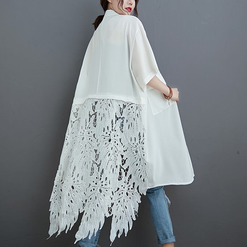 ラージサイズ夏女性ファットMMルーズリテラシーレースステッチ中空半袖シャツスカートミドル丈スタンドカラードレス 大きめサイズ サマー 夏物 TB2-8 TB2-848884334196