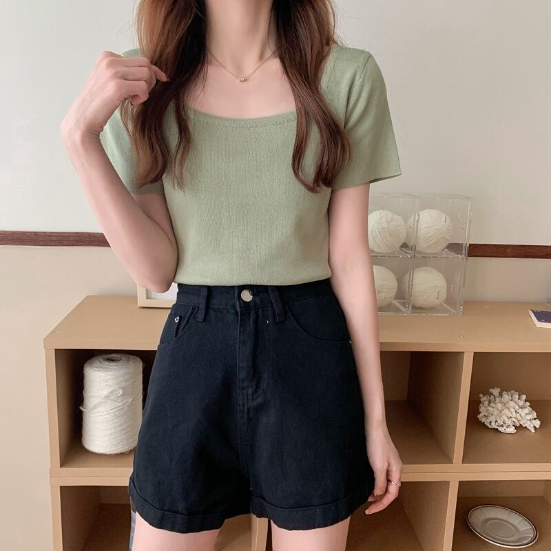 ホワイト半袖Tシャツレディースサマー薄手ニットセータースリムスリミング原宿風ボトミングローラウンドネック鎖骨トップ かわいい 夏物 Oネック TB2 TB255278597363