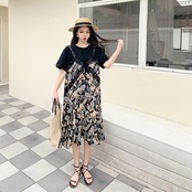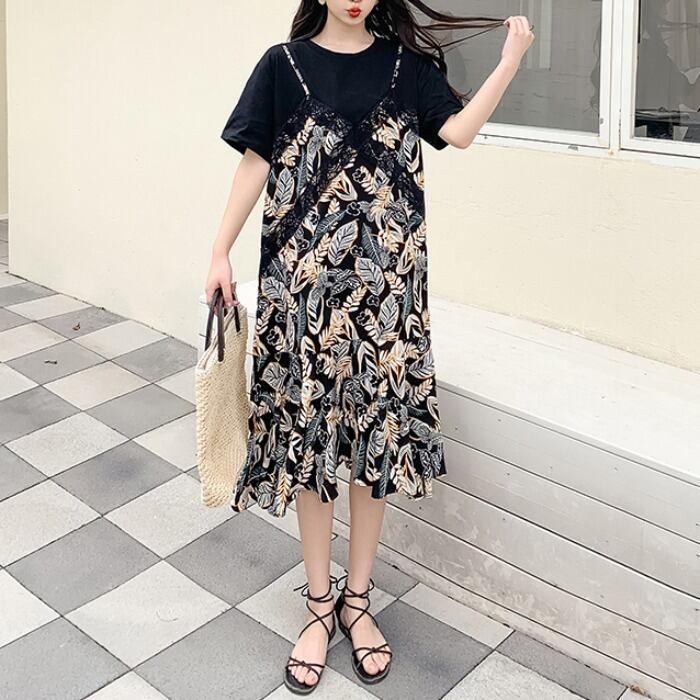 カバーヒップファットmmミドル丈ビッグファットスカートスモールフローラルフェイクツーピーススプライシングドレスラージサイズ蓮の葉夏 大きめサイズ サマー 夏物 花柄 TB2-36 TB5-237559275694