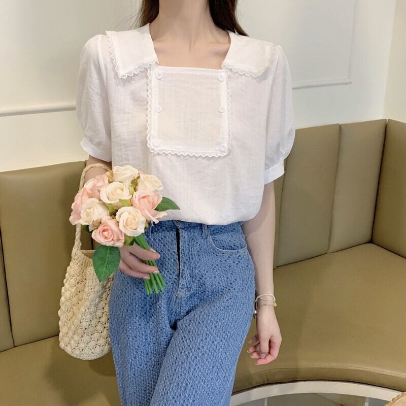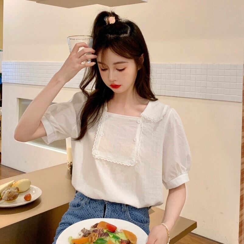 Sanmuziファストファッション婦人服〜2021新しいシックなネイビーカラーバブル半袖レースシャツトップ TB2-6 TB2-681170548018