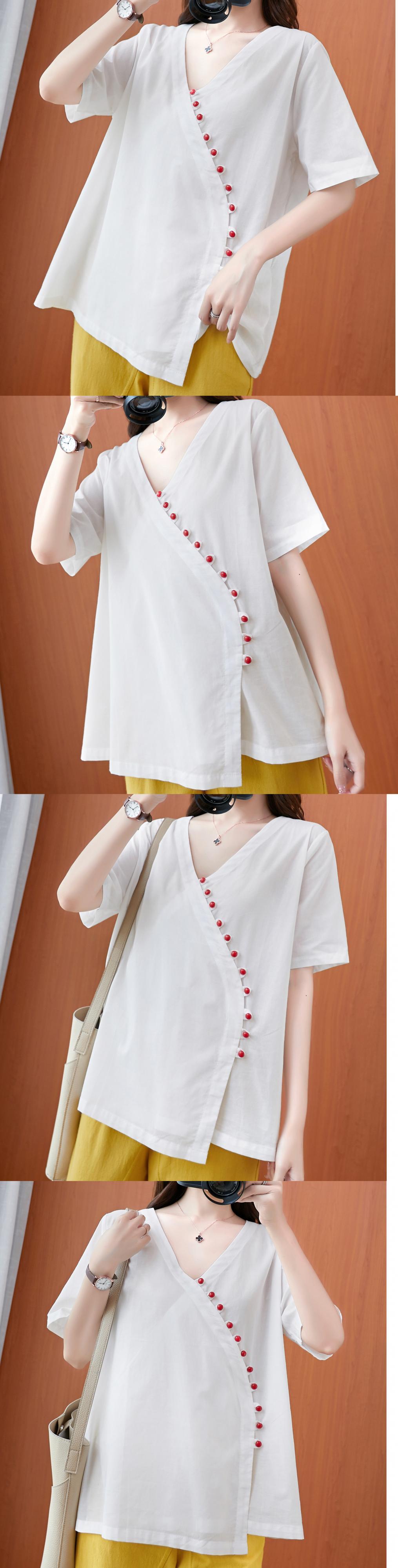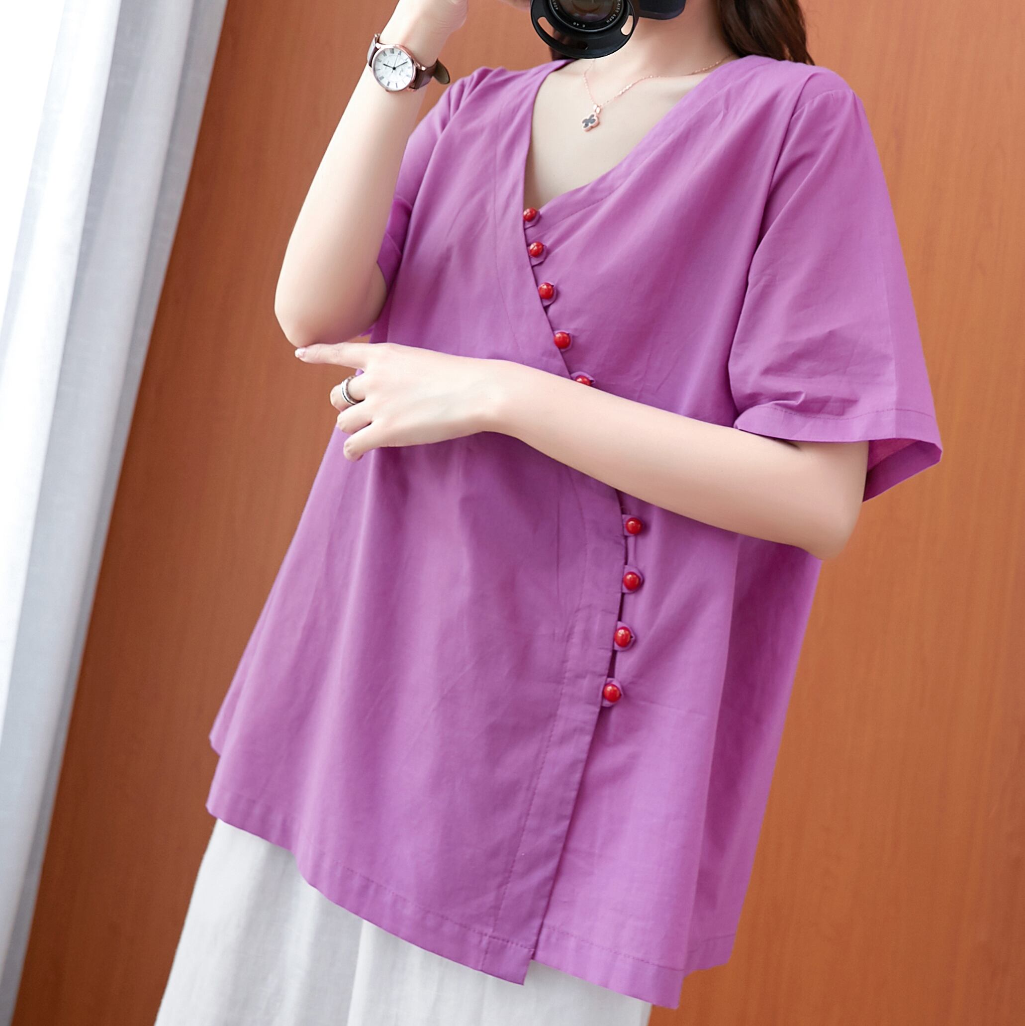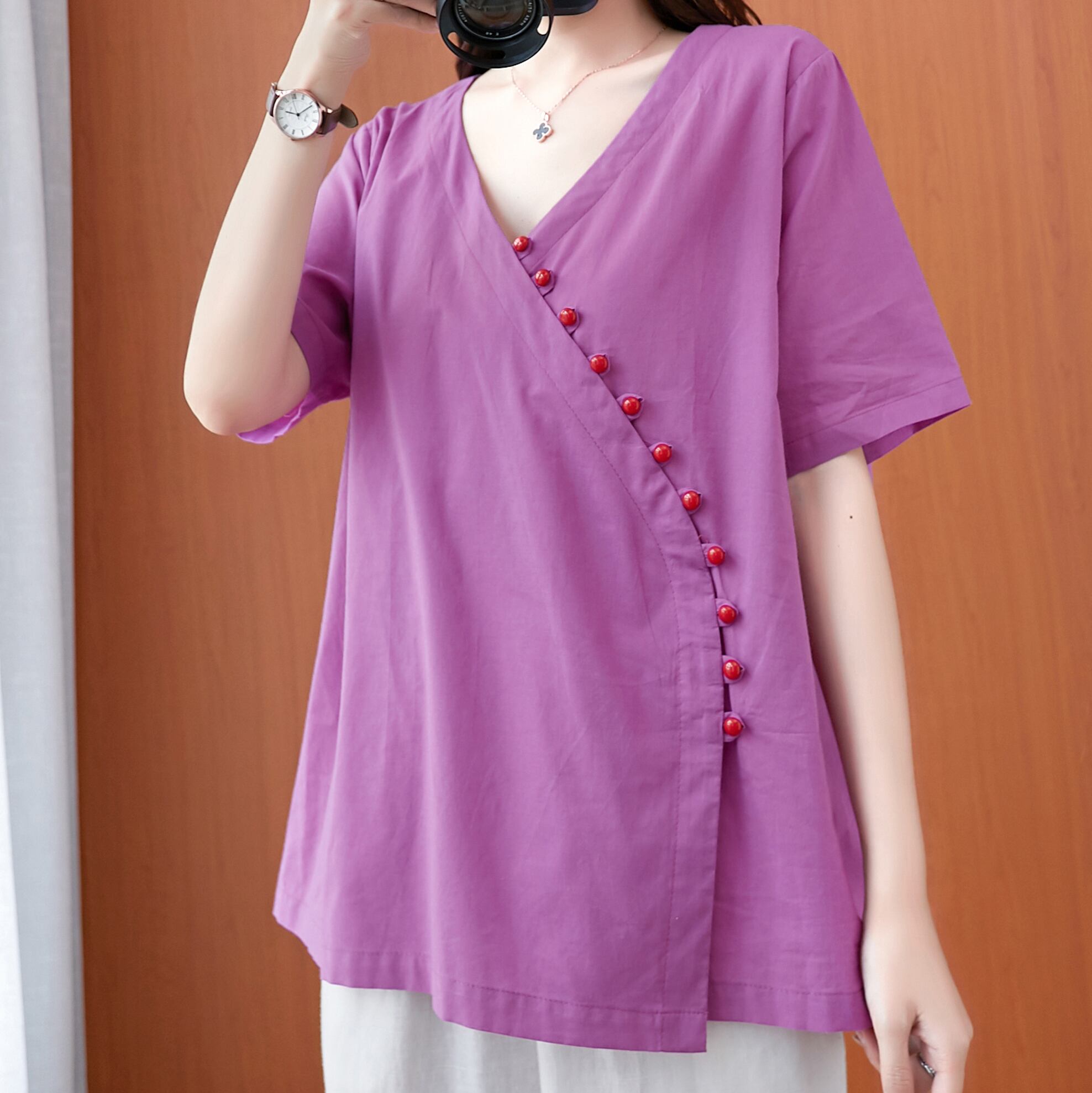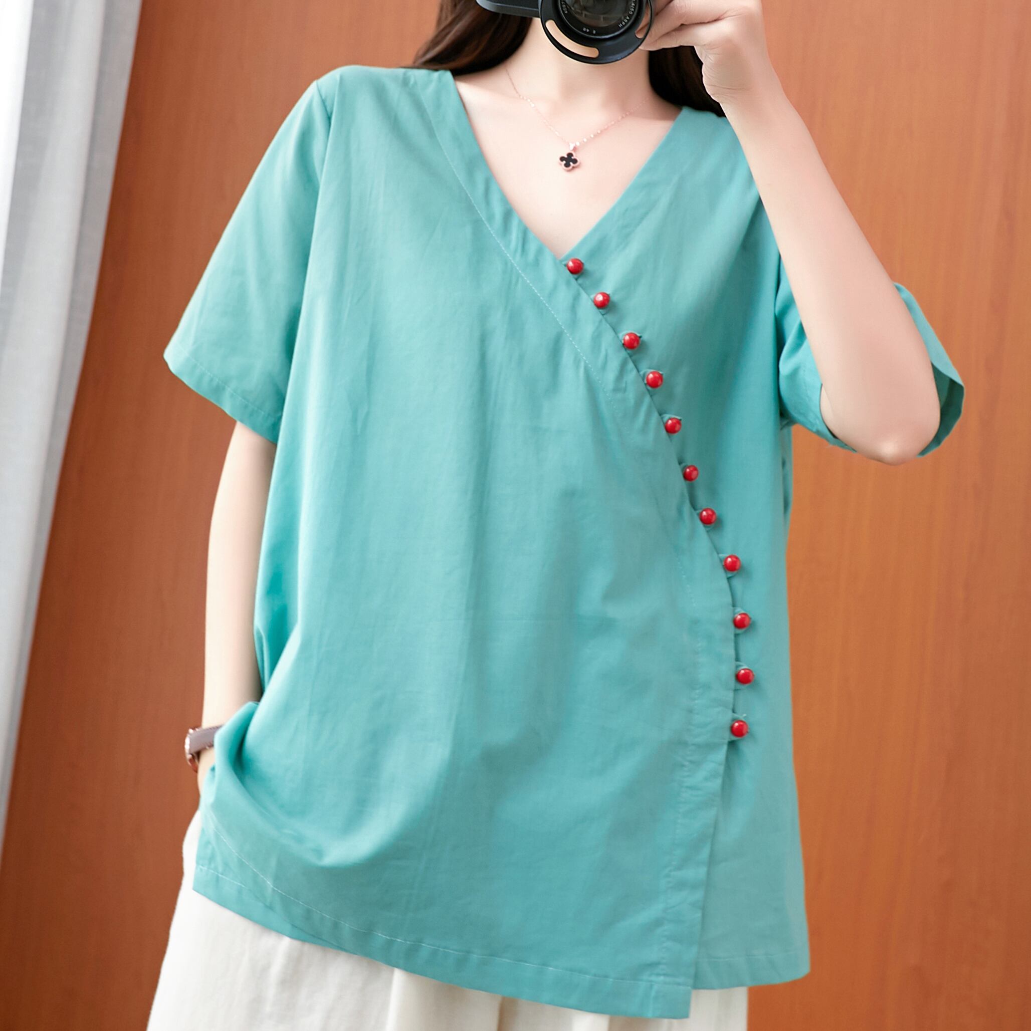 2020年夏の新しい半袖トップコットンとリネンの気質薄いレトロな文学的中国風ルーズVネックカジュアルTシャツ サマー 夏物 TB2-12 TB2-1277029977961