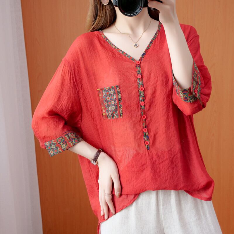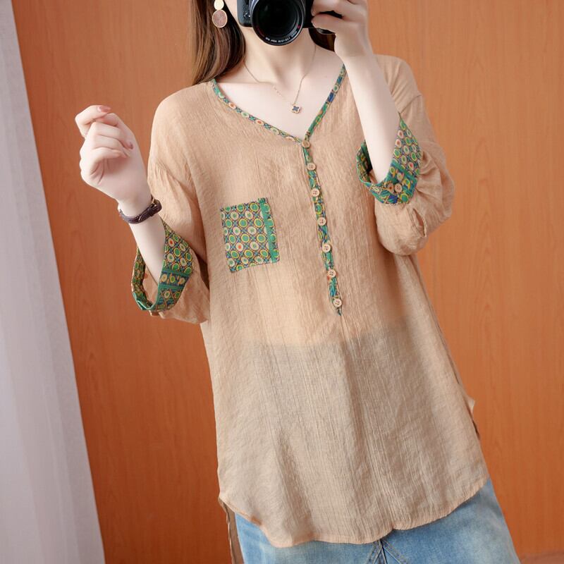 2021年夏の文芸的レトロプリントVネックシャツレディース七分袖ルーズラージサイズ薄手ステッチ薄手トップ 大きめサイズ サマー 夏物 TB2-12 TB2-1268902551107
