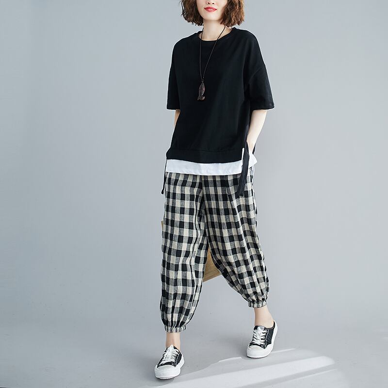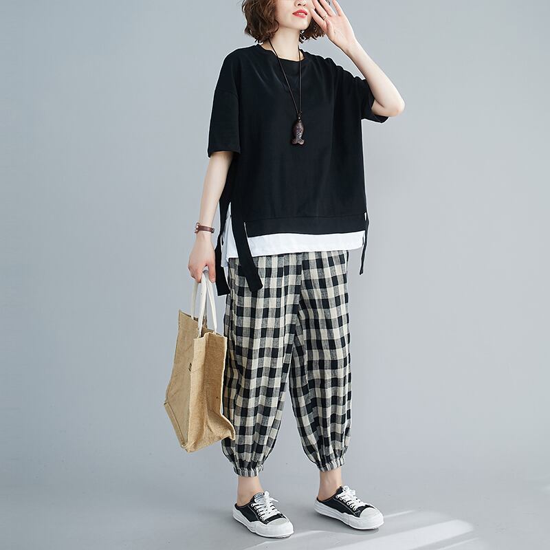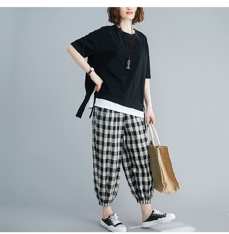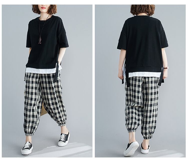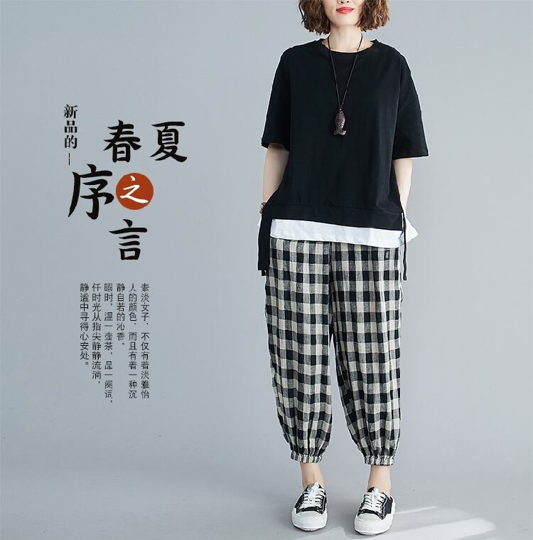 大きいサイズの太った姉妹カバー腹痩身スーツ女性の夏のルーズフェイクツーピースブラウス+ツーピースチェック柄ハーレムパンツ 大きめサイズ サマー 夏物 TB2-8 TB2-839639392391