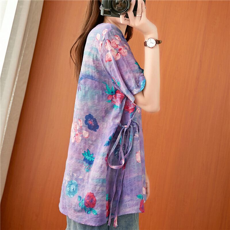 2021年夏の文学とアートレトロなコットンとリネンのプリント斜めレースアップシャツレディース半袖ラージサイズパープルラミートップ 大きめサイズ サマー 夏物 TB2-12 TB2-1257078180055