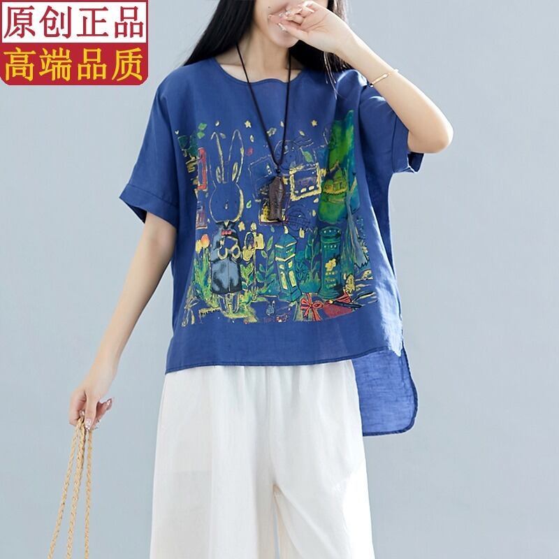 2021年夏のレトロな文芸プリントコットンとリネンの半袖Tシャツトップ女性は大きいサイズのフロントショートバックロングトップを緩めます 大きめサイズ サマー 夏物 TB2-12 TB2-1264749869350