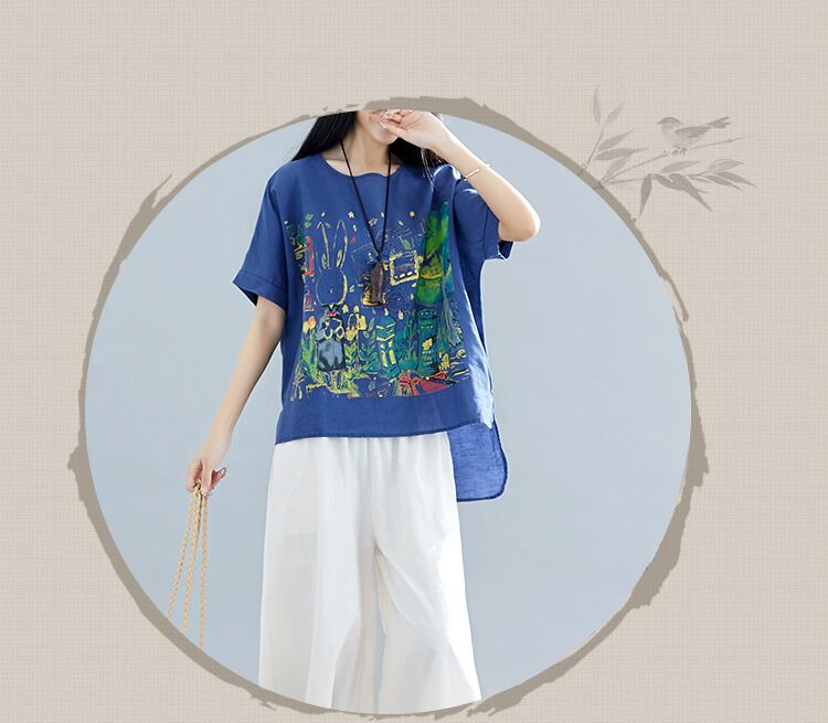 2021年夏のレトロな文芸プリントコットンとリネンの半袖Tシャツトップ女性は大きいサイズのフロントショートバックロングトップを緩めます 大きめサイズ サマー 夏物 TB2-12 TB2-1264749869350