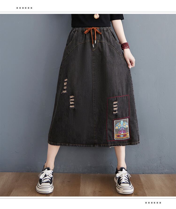 夏の文学とアートレトロホール刺繍デニムスカート女性の伸縮性ウエストミドル丈ルーズカジュアルAラインスカート レッド エラスティック サマー 夏物 TB2-12 TB2-1270987850965