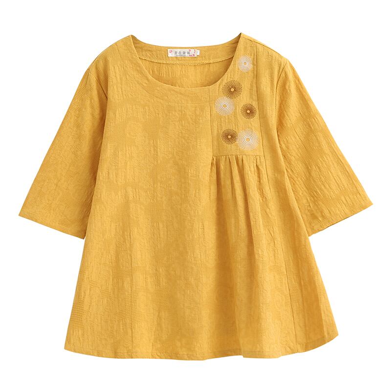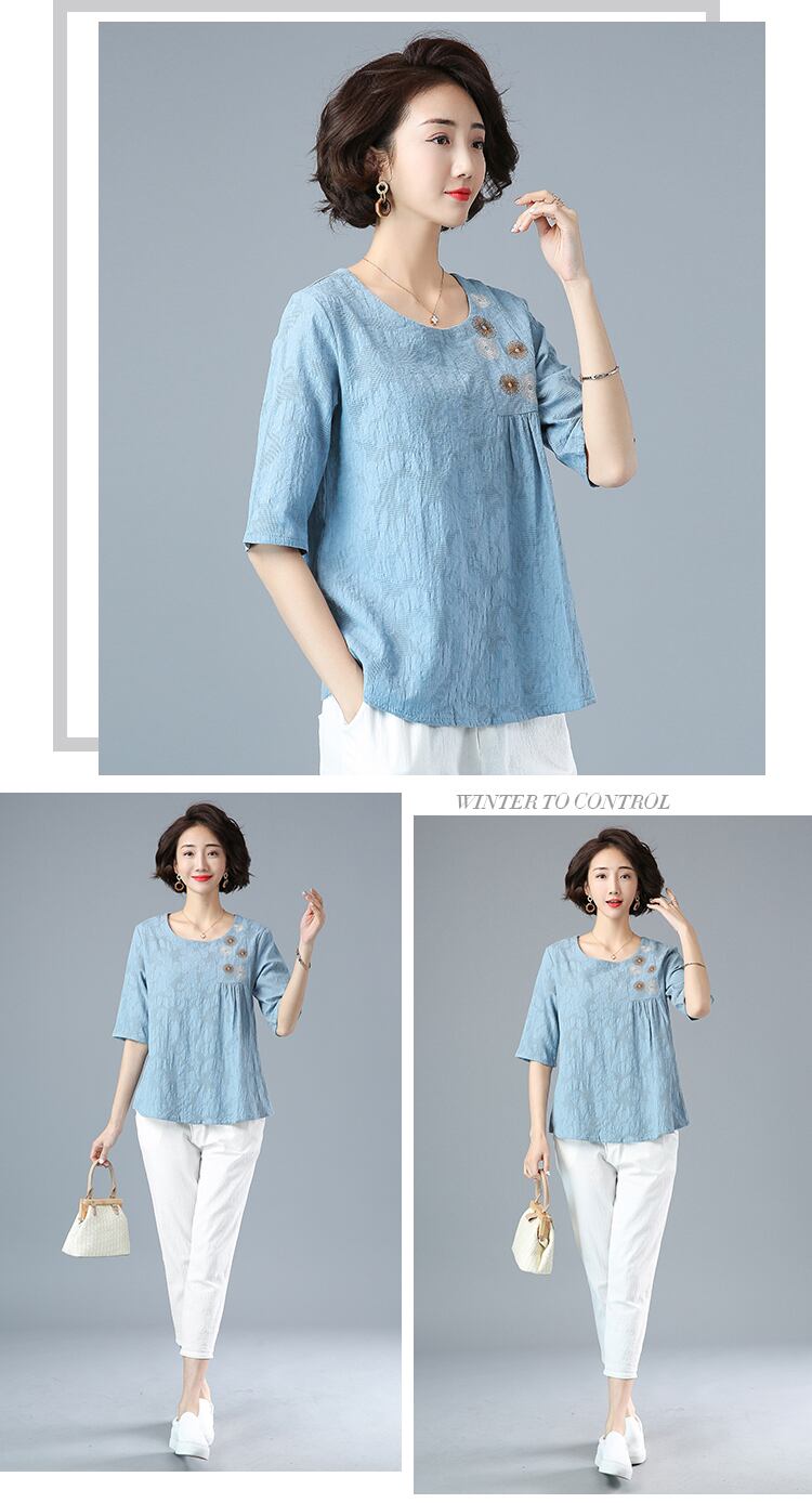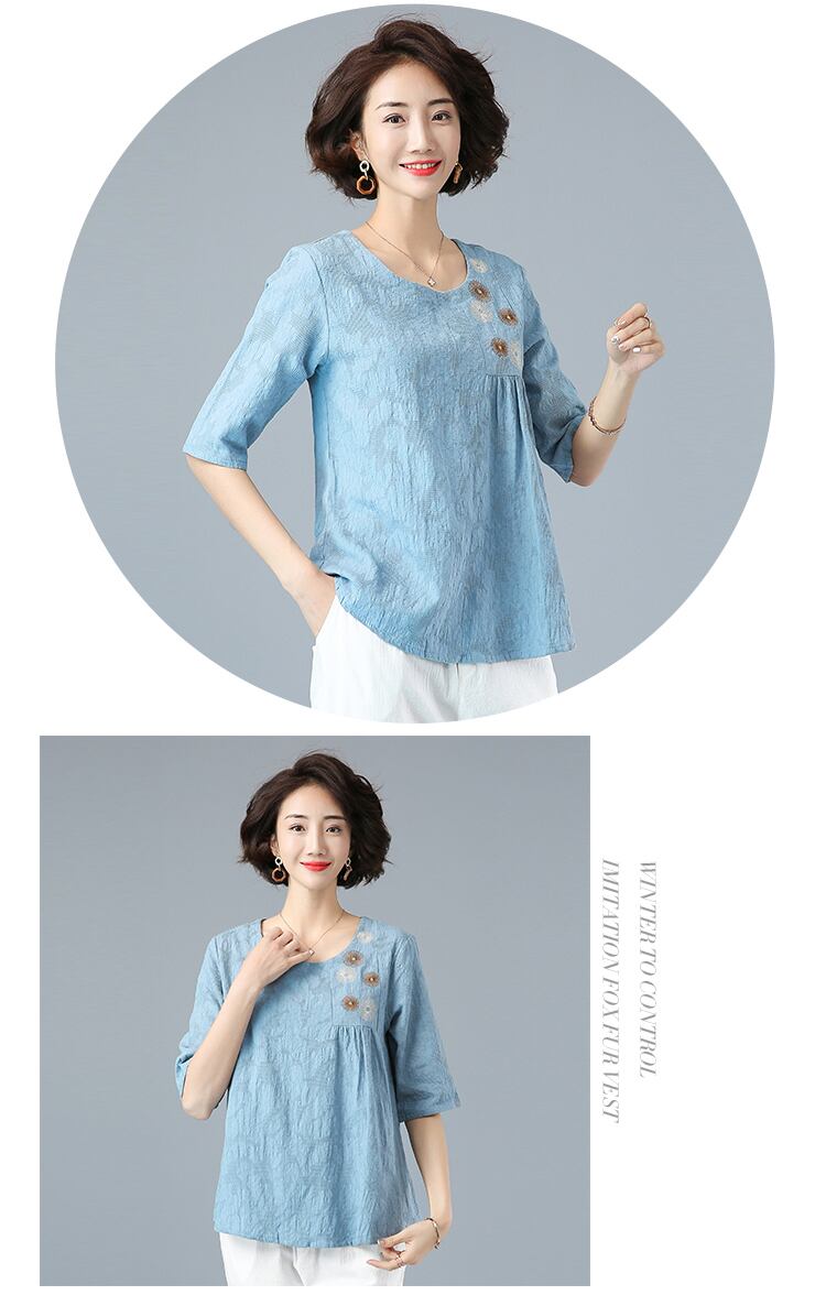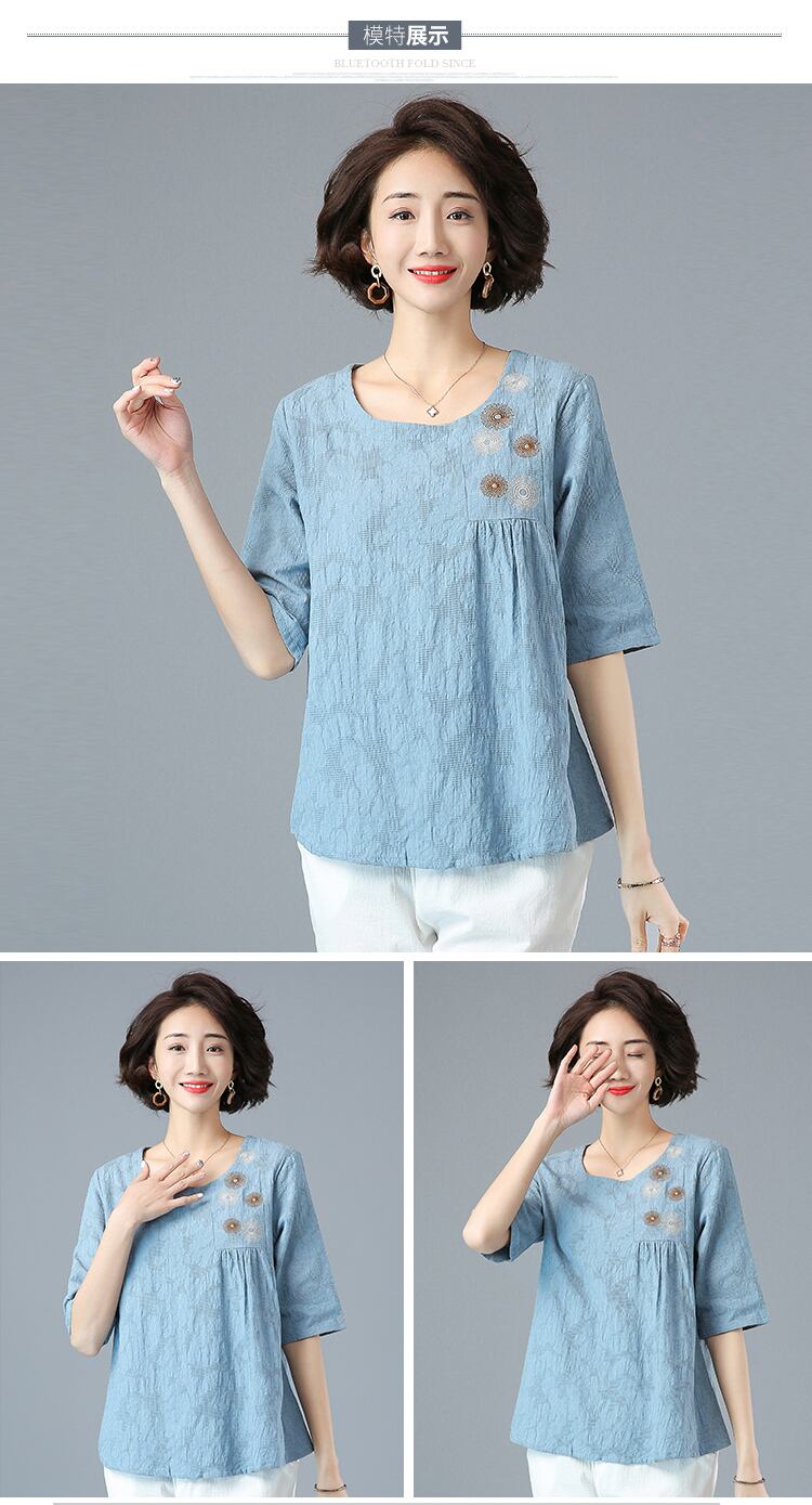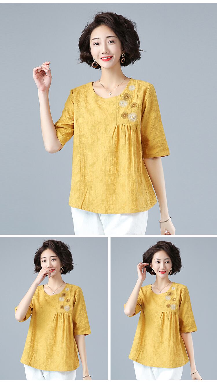 2021年春夏のコットンとリネンの半袖Tシャツレディースジャカード刺繍ラウンドネックボトミングシャツ文学的なレトロな七分袖シャツ スプリング 春物 サマー 夏物 Oネック TB2-12 TB2-1290965365670