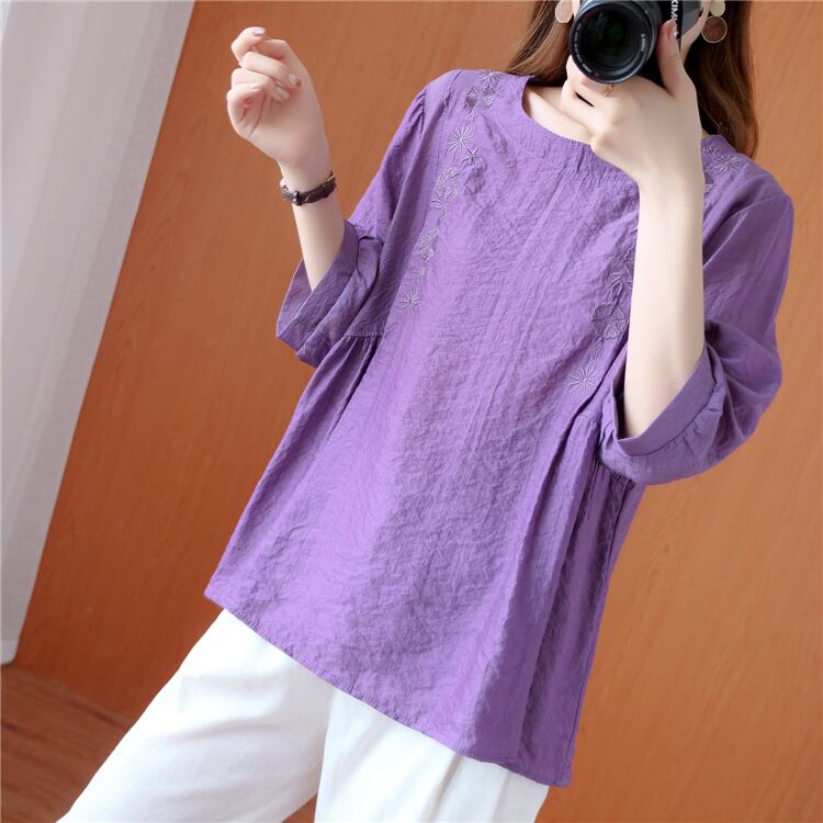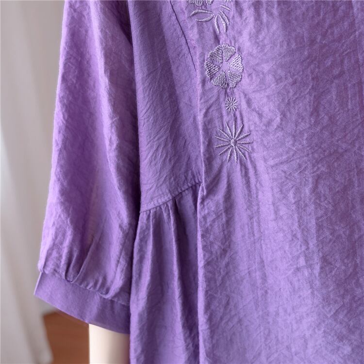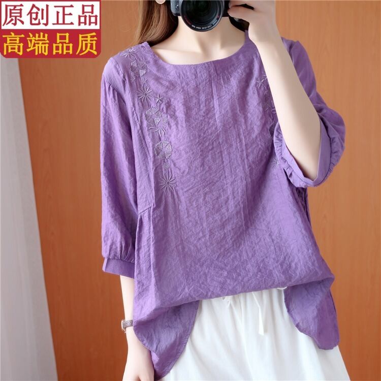 レトロな文学とアートラミー刺繡ブラウス女性ルーズワイルドラウンドネックランタンスリーブコットンとリネンTシャツ半袖ベビーシャツ夏 刺繍 サマー 夏物 Oネック TB2-12 TB2-1273178572429