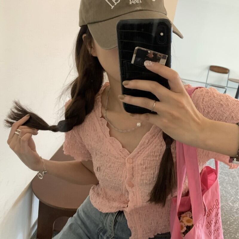 フランスのVネックニット半袖Tシャツ女性2021年夏新バージョンルーズで薄いワイルドクロップトップトレンド サマー 夏物 TB2-6 TB2-699225806235
