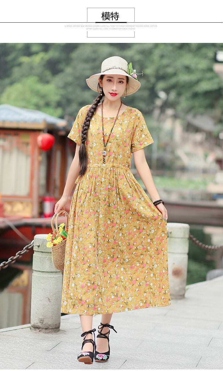 2021年夏の新しいレトロエスニックスタイルの半袖女性用巾着薄綿とリネンプリントのミドル丈ドレス コットン サマー 夏物 TB2-12 TB2-1277768031779