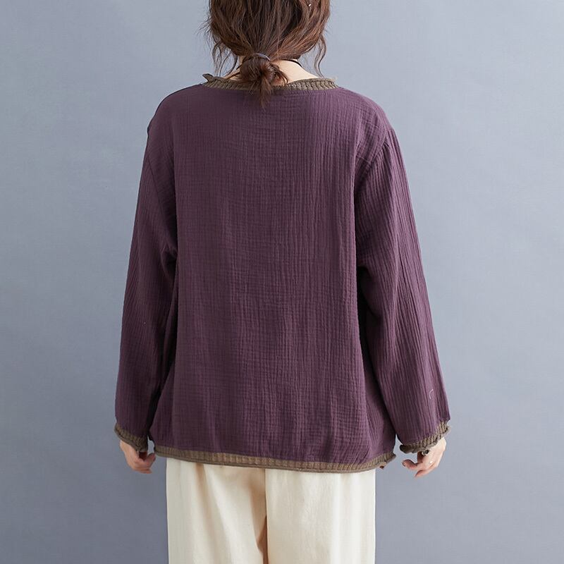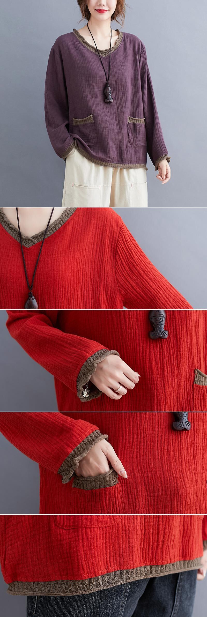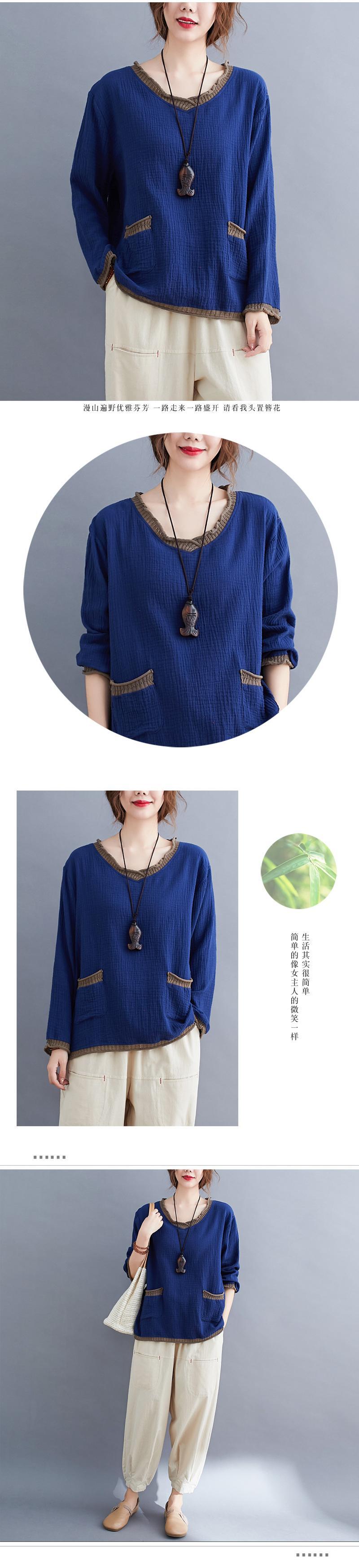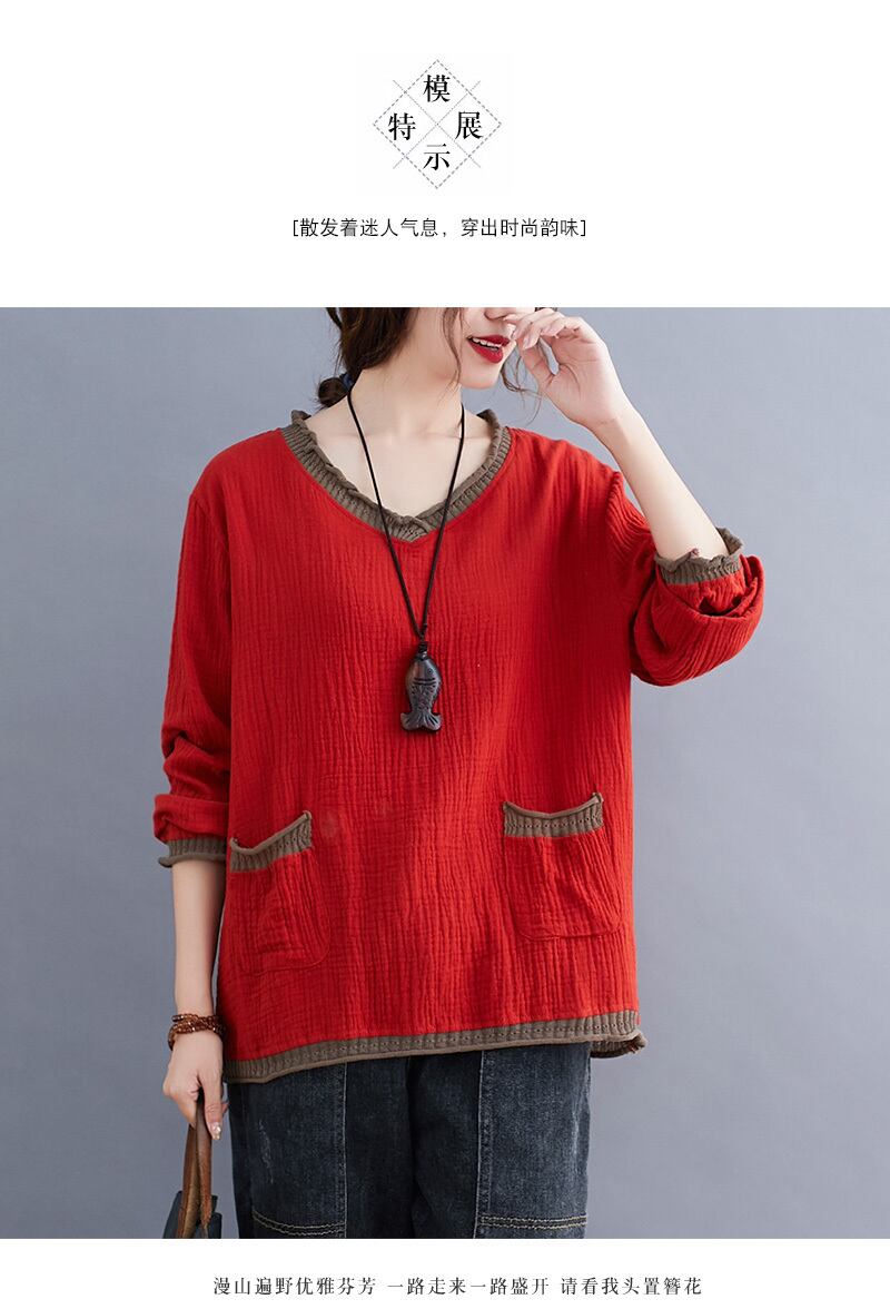 文学とアートレトロ無地Vネックスリミングボトミングシャツ女性秋レジャーカバー腹縮小ポケット長袖Tシャツ潮秋 ロング オータム 秋物 ソリッドカラー TB2-8 TB2-823438814176