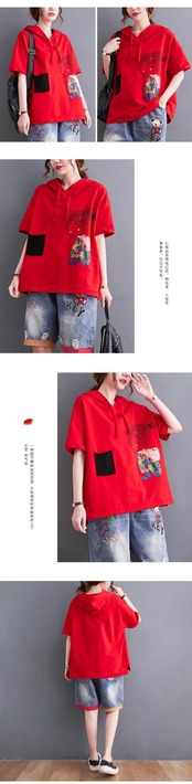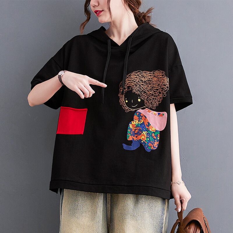 2021年夏の新作女性バージョンルーズトップラージサイズアートステッチポケットプリントフード付き半袖Tシャツ 大きめサイズ サマー 夏物 TB2-12 TB2-129222869708