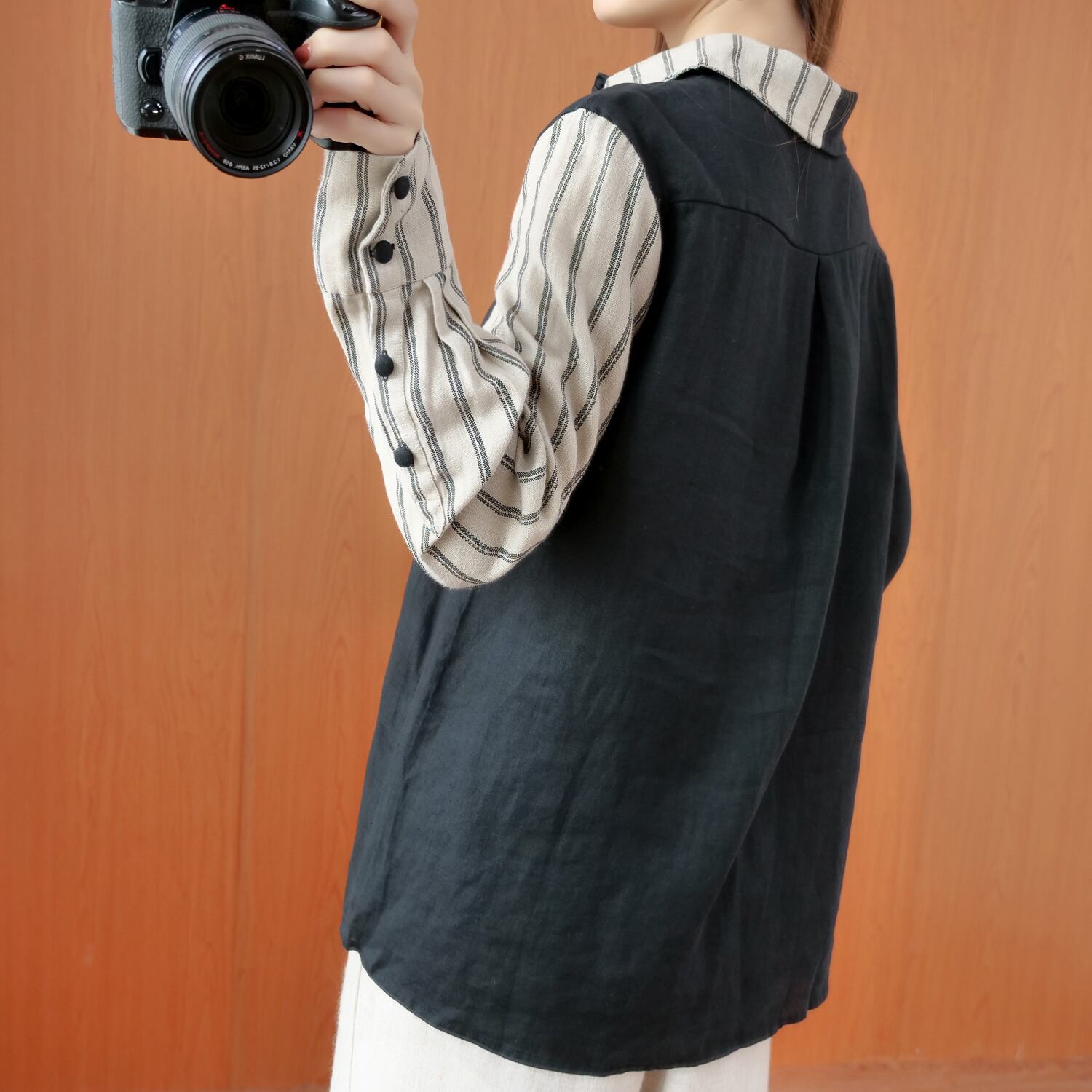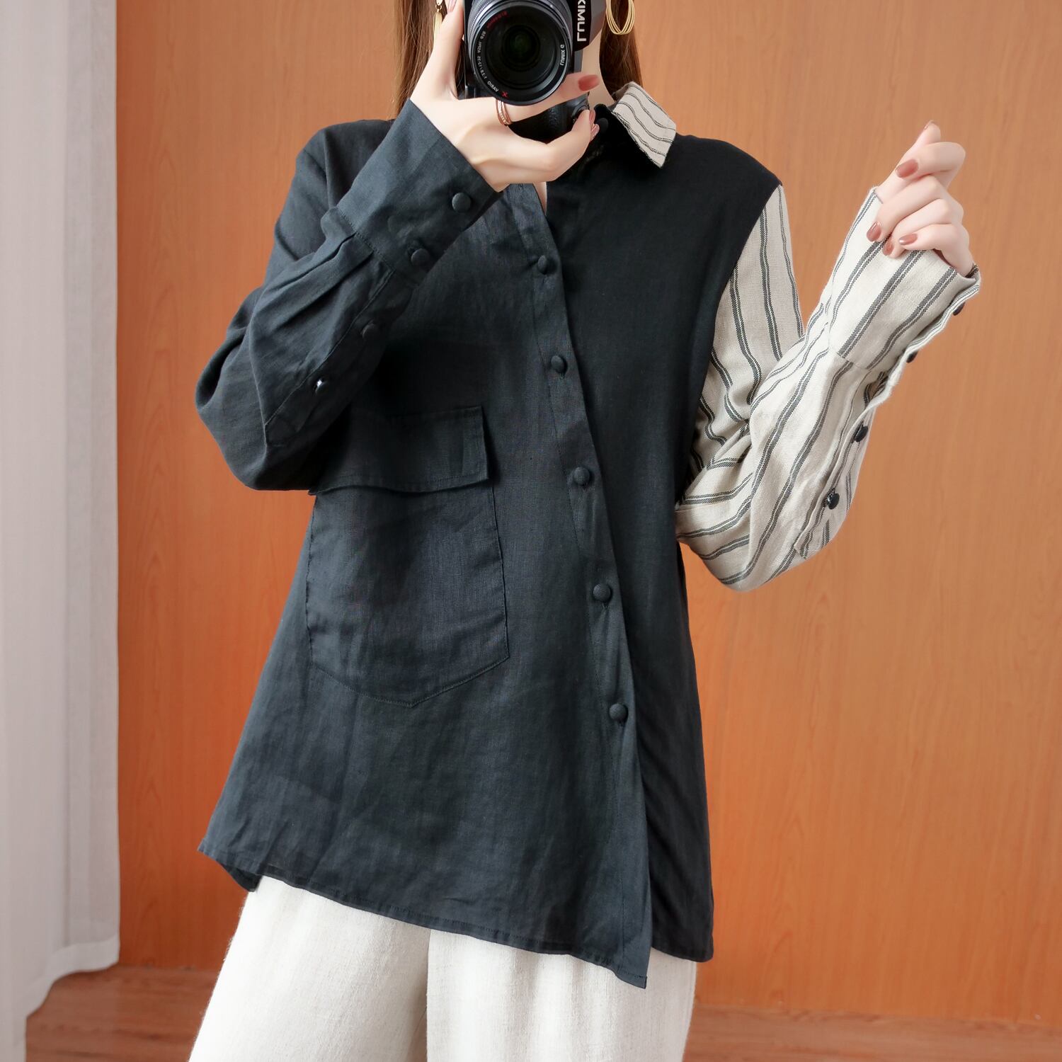ファットMMデザインセンスのニッチなトップス、大きなサイズの流行の秋の服、ウエスタンスタイル、非対称のステッチコットンとリネンの長袖シャツの女性 ロング 大きめサイズ オータム 秋物 TB2-8 TB2-810209857156