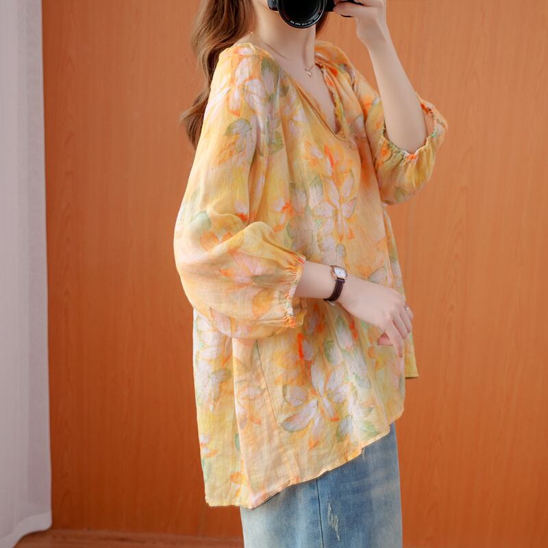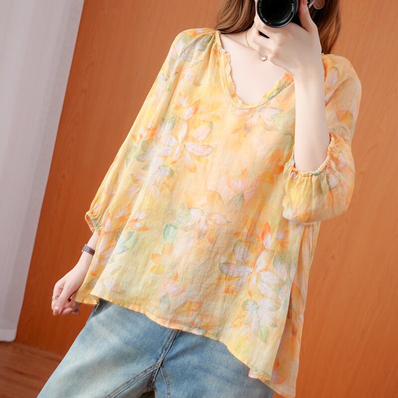 2020年夏の新作レトロルーズプルオーバーシャツプリントVネックLシャツレディース薄袖ベビーシャツ 大きめサイズ サマー 夏物 Tシャツ TB2-12 TB2-1254231044388