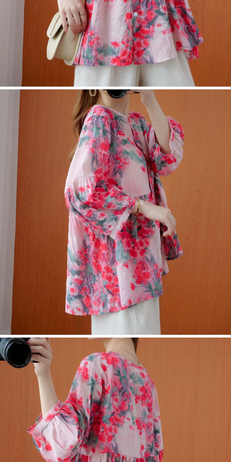 春と夏の新しいスタイルの文学的な綿とリネンのプリントブラウス、プラスサイズの女性のエスニックスタイル、ルーズベリーシルクコットンシャツ 大きめサイズ スプリング 春物 サマー 夏物 TB2-12 TB2-1239186020341