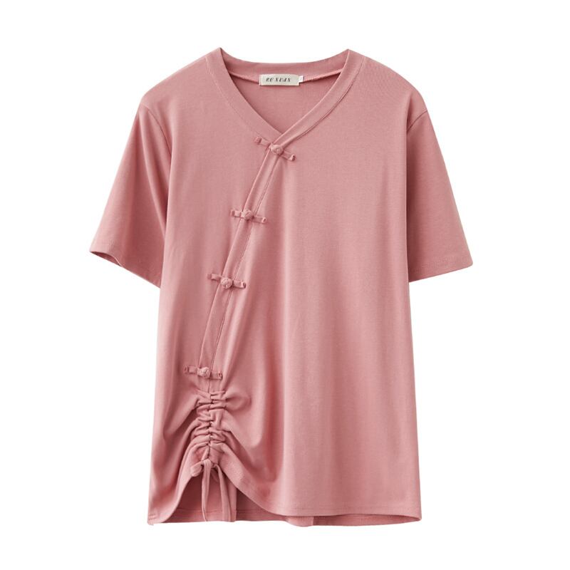 2021年夏の文学レトロ無地ディスクバックルドローストリングTシャツラージサイズ伸縮性ルーズ半袖Vネックブラウス女性コンピオネート エラスティック 大きめサイズ サマー 夏物 ソリッドカラー TB2-12 TB2-1270655056313