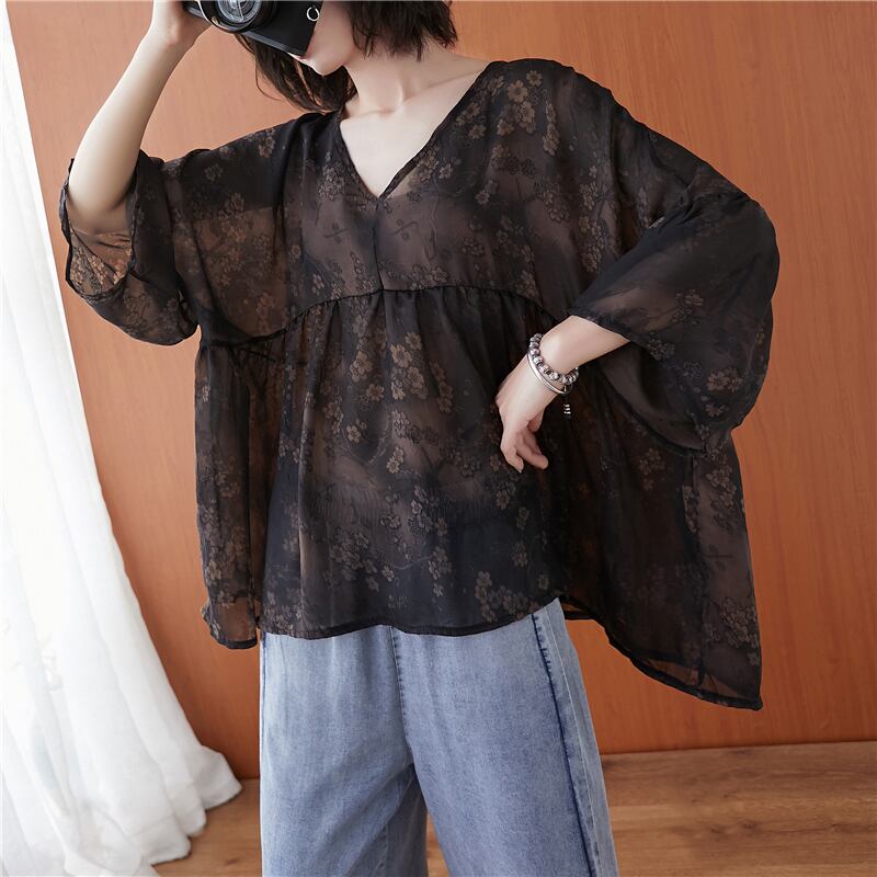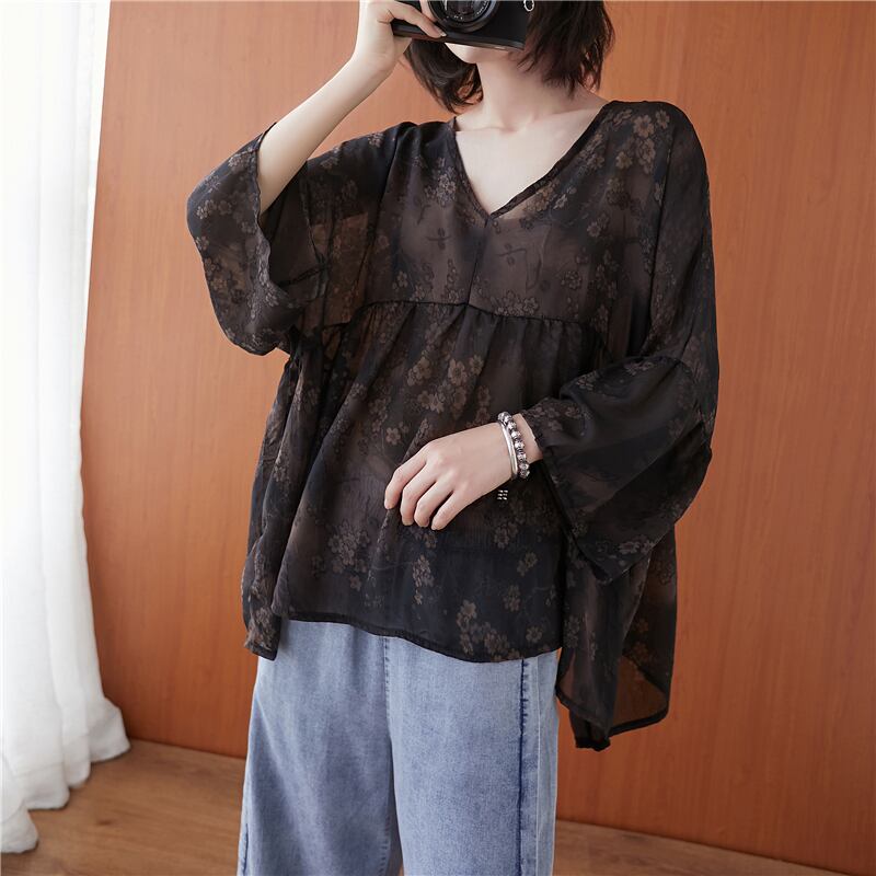 ラージサイズファットmmサマーレトロエイジドフローラルドールシャツは薄く、ウエスタンスタイルのカバーミート、七分袖VネックシフォンTシャツ女性 大きめサイズ 夏物 花柄 TB2-8 TB2-839716283310