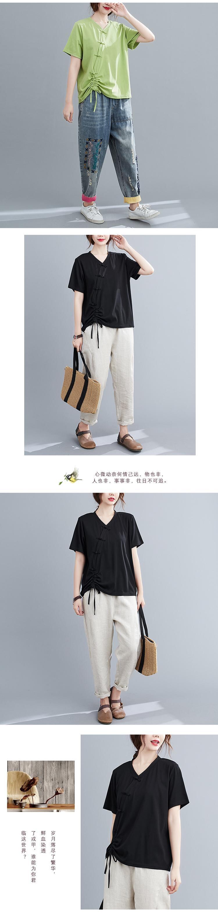 2020年夏の新しいルーズラージサイズレトロバックル裾ドローストリングトップは薄くて用途の広いVネック半袖Tシャツの女性 大きめサイズ サマー 夏物 TB2-8 TB2-886238732749