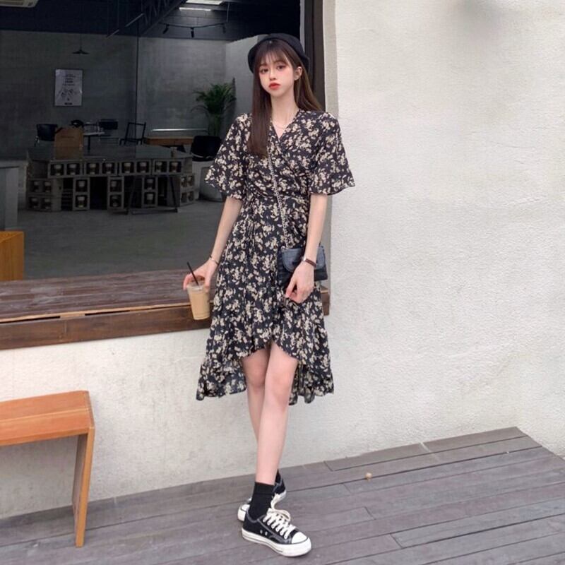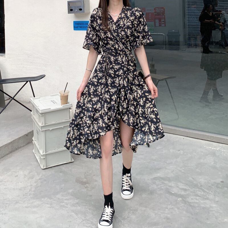 2021年夏新作レトロウエストスリミングミドル丈Vネックフローラルアシンメトリー半袖ワンピースレディース サマー 夏物 花柄 TB2-6 TB2-665925344748